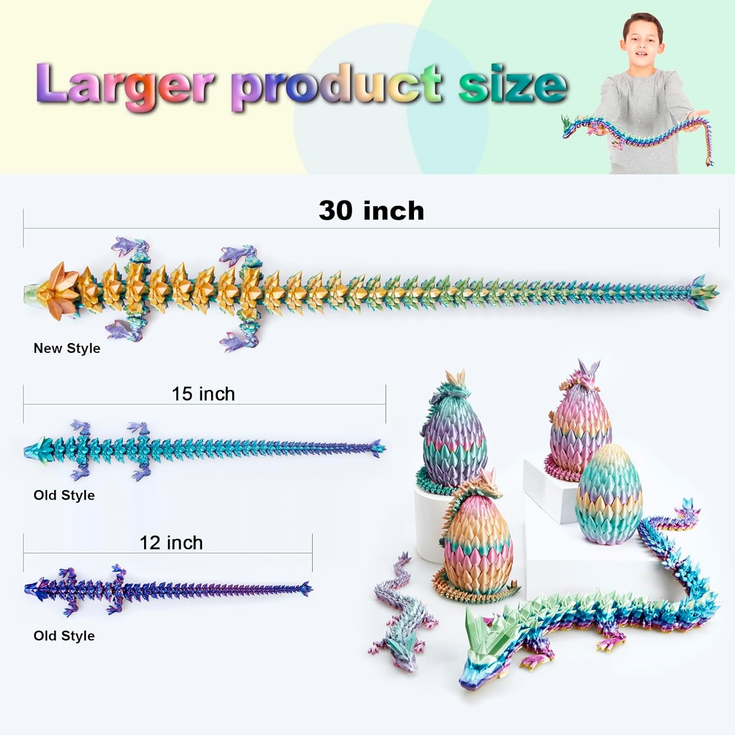 - [30'' large size, more fun] Compared to the 24'' printed dragon, our 30-inch 3D dragon is more suitable for playing in your hand. Its joints are flexible and its shape can be manipulated at will. You can put it Coiled on some brackets, it looks like a lifelike dragon appearing in front of you.