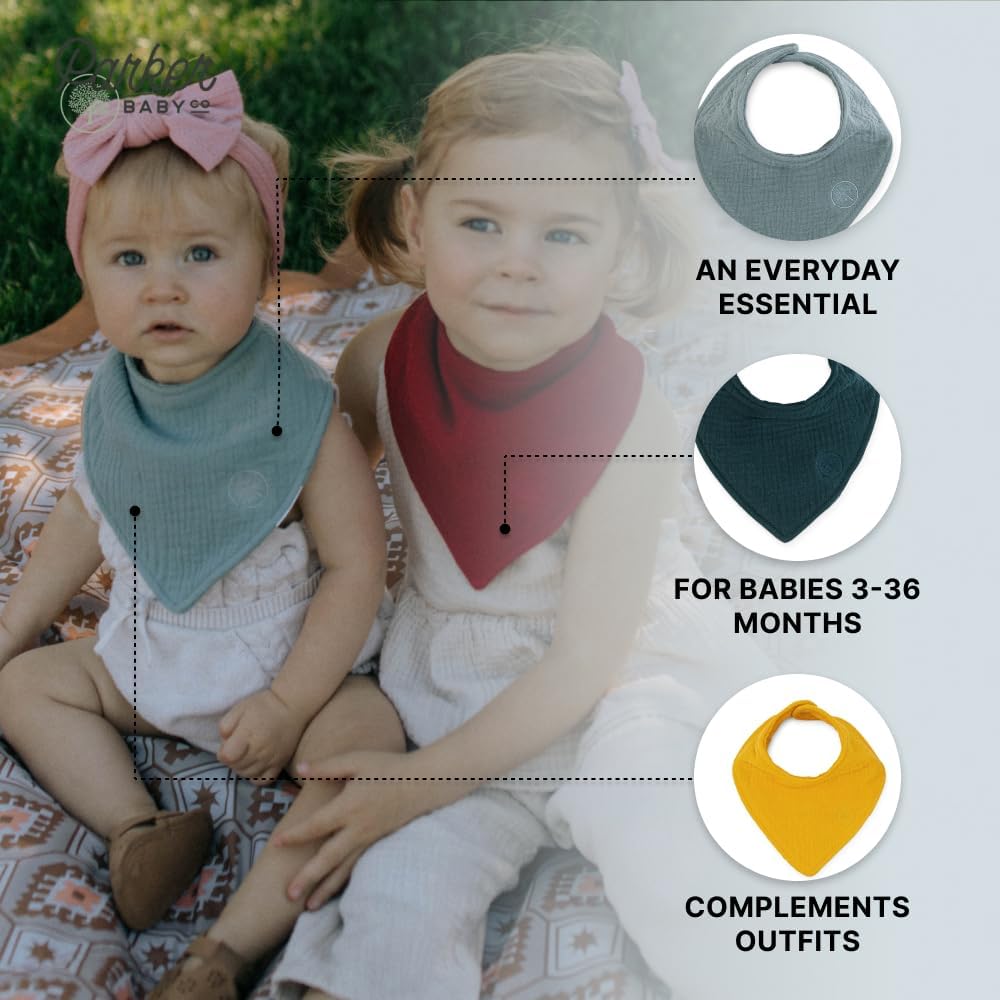 - PREMIUM 4-LAYER MUSLIN COTTON FOR MAXIMUM ABSORPTION - Made with four layers of buttery soft muslin cotton and a plush terry inner core, these baby bibs for drooling and teething are thick enough to soak up drool, spit-up, and food messes without feeling bulky. The dense yet breathable weave keeps baby’s outfit clean and dry, while maintaining softness against delicate skin-all day long.