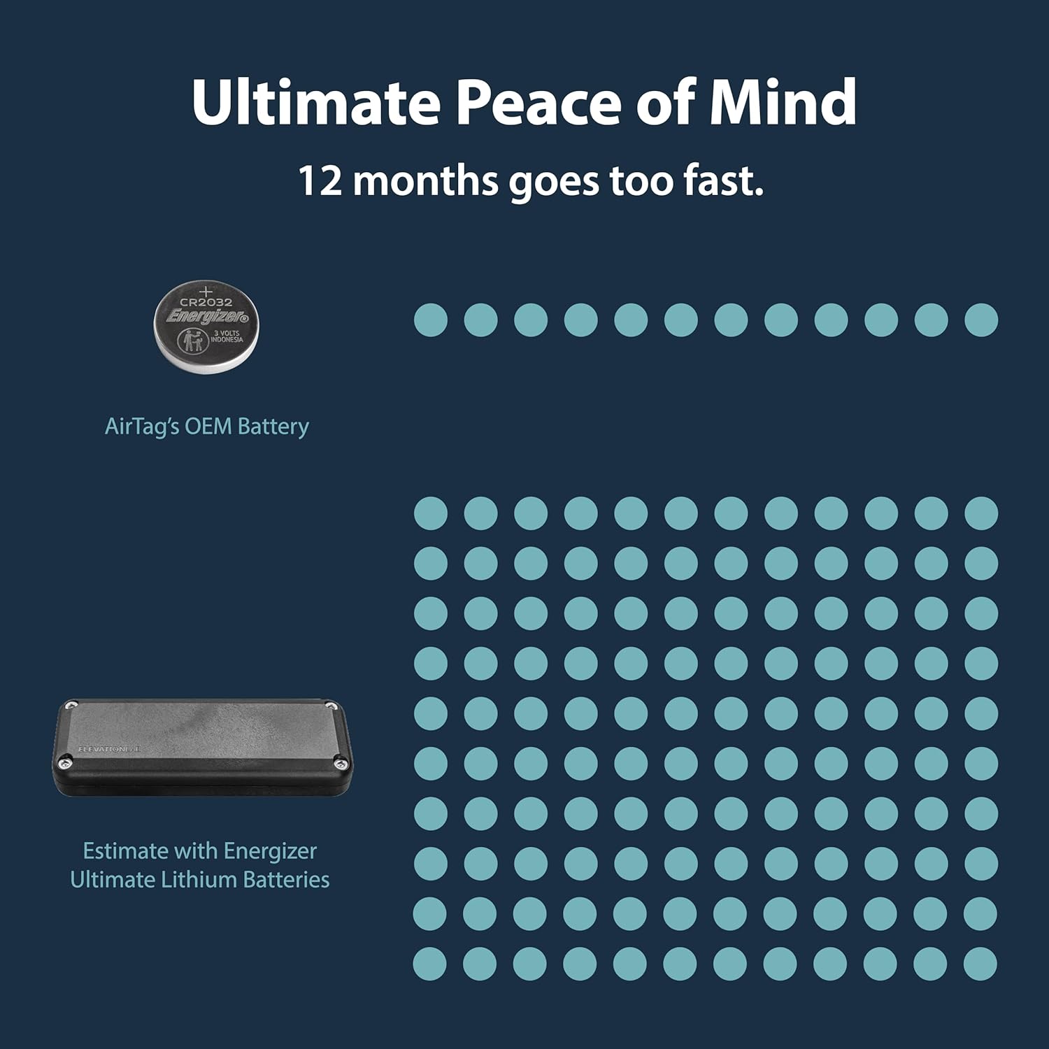 - The ultimate peace of mind: 12 months goes fast, and the last thing you want is a dead AirTag on something you value. Great for vehicles, trailers, motorcycles, luggage, camera bags, backpacks, snowmobiles, tool boxes, etc.