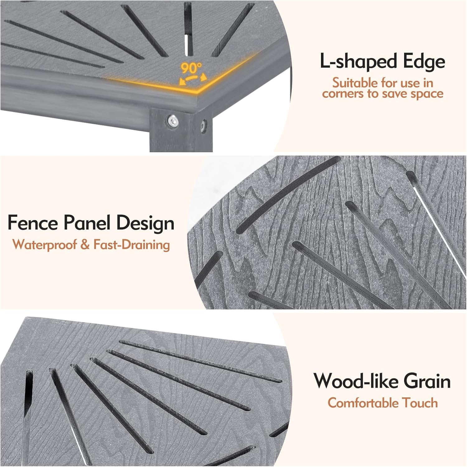- 【HDPE Material】Made of High-density polyethylene (HDPE) and stainless steel hardware, it will not crack, scratch, rust, or fade over time. The triangular structure and the thickened legs ensure the stability of the corner shower bench. In addition, the surface is designed with faux wood grain, making it sturdy and durable while maintaining a vintage and elegant aesthetic.