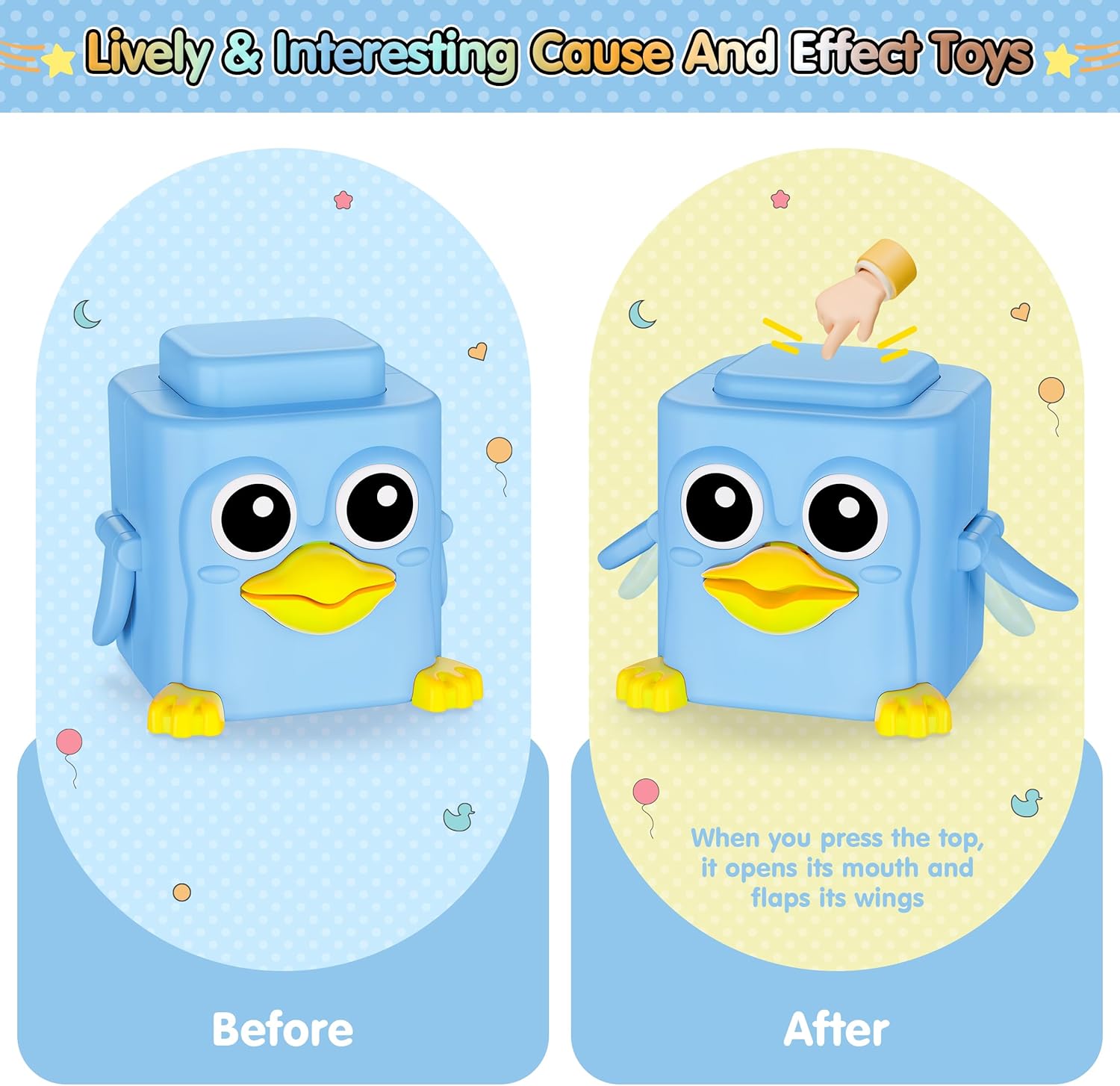 - Toddler Interactive Cause and Effect Toys: Colorful and novel shape is eye-catching, which helps stimulate baby's senses and exercise hand-eye coordination. Fun and easy to operate, easily mobilize baby's curiosity and help them understand the cause and effect relationship of the game. Cultivates and improves baby's fine motor skills and attention span while enhancing parent-child bonding