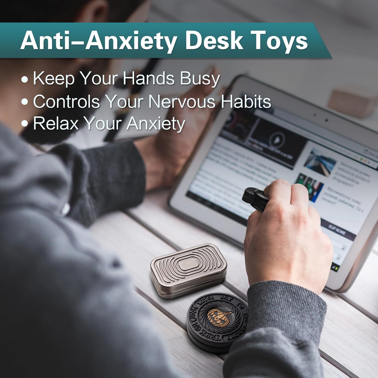 - Quality Craftsmanship: Each fidget toy in this set is meticulously crafted from high-quality steel to ensure durability and long-lasting enjoyment. Our fidget spinner boasts smooth spins for endless entertainment, while the fidget slider offers satisfying clicks and slides. The Haptic Coin provides a unique tactile experience that's both soothing and engaging