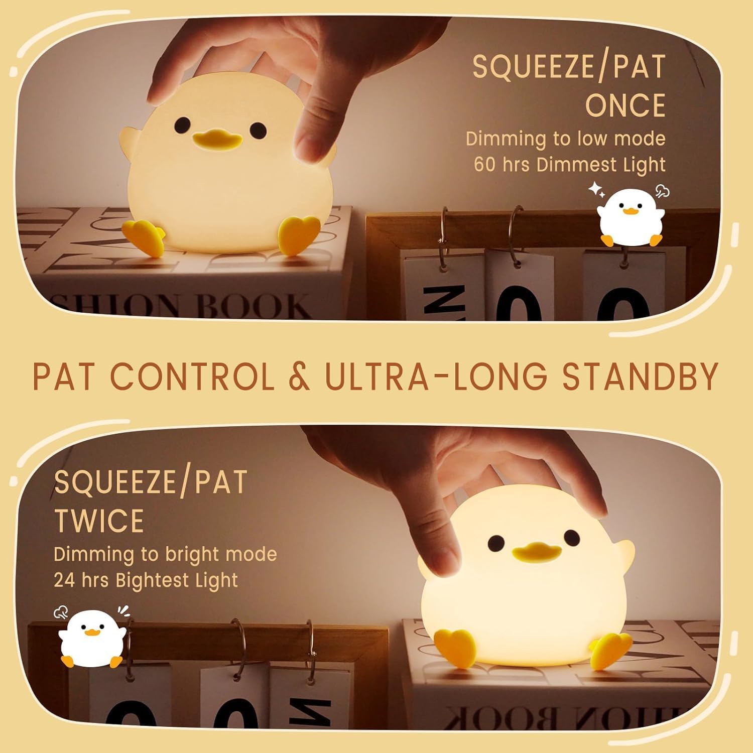 - ๐๐ข๐ฆ๐ฆ๐๐๐ฅ๐ ๐๐ฎ๐๐ค ๐๐ฎ๐ญ๐ ๐๐๐ฆ๐ฉ๐ฌ: You can touch the lovely ducky night lights with 20 minutes timer choice, no need to manually shut it off. 2 levels different brightness settings: You can tap the dodo duck body to adjust the brightness of this cute lights in the weak and normal gear. Warm and soft lighting, let you sleep easily in a warm and cozy atmosphere. You can of course also use it during the day as a cute night light lamp or a decorative light for their room