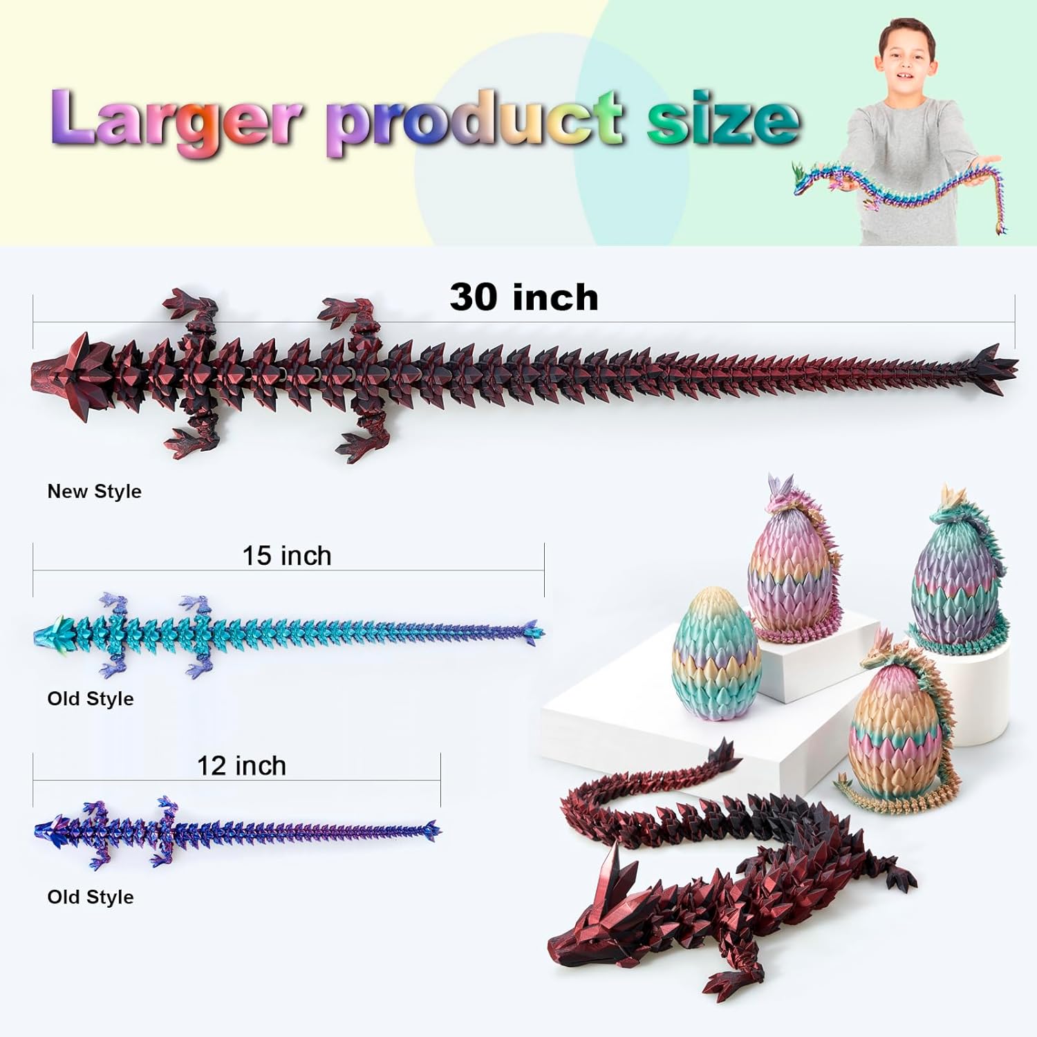 - [30'' LARGE SIZE, MORE FUN] 3D Printed Dragon, Compared with the 24'' printed dragon, our 30 inch 3D dragon toy is more suitable to hold and play with in your hand. It has flexible joints and a shape that can be manipulated at will. You can coil it on a stand and it will appear like a lifelike dragon in front of you.
