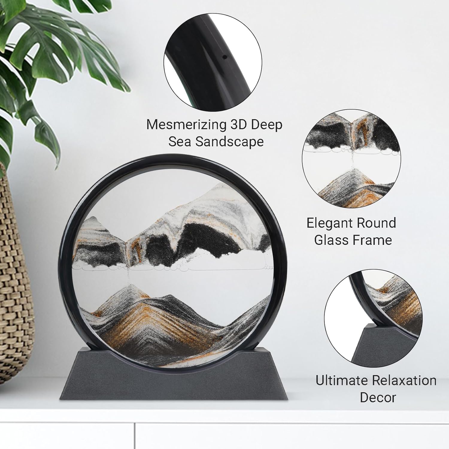- ELEGANT ROUND GLASS FRAME: Encased in an elegant round glass frame, this Moving Sand Art is not only a beautiful decorative piece but also a captivating interactive experience. Its sleek design makes it suitable for any desktop, home, or office setting, adding a touch of sophistication to your decor.