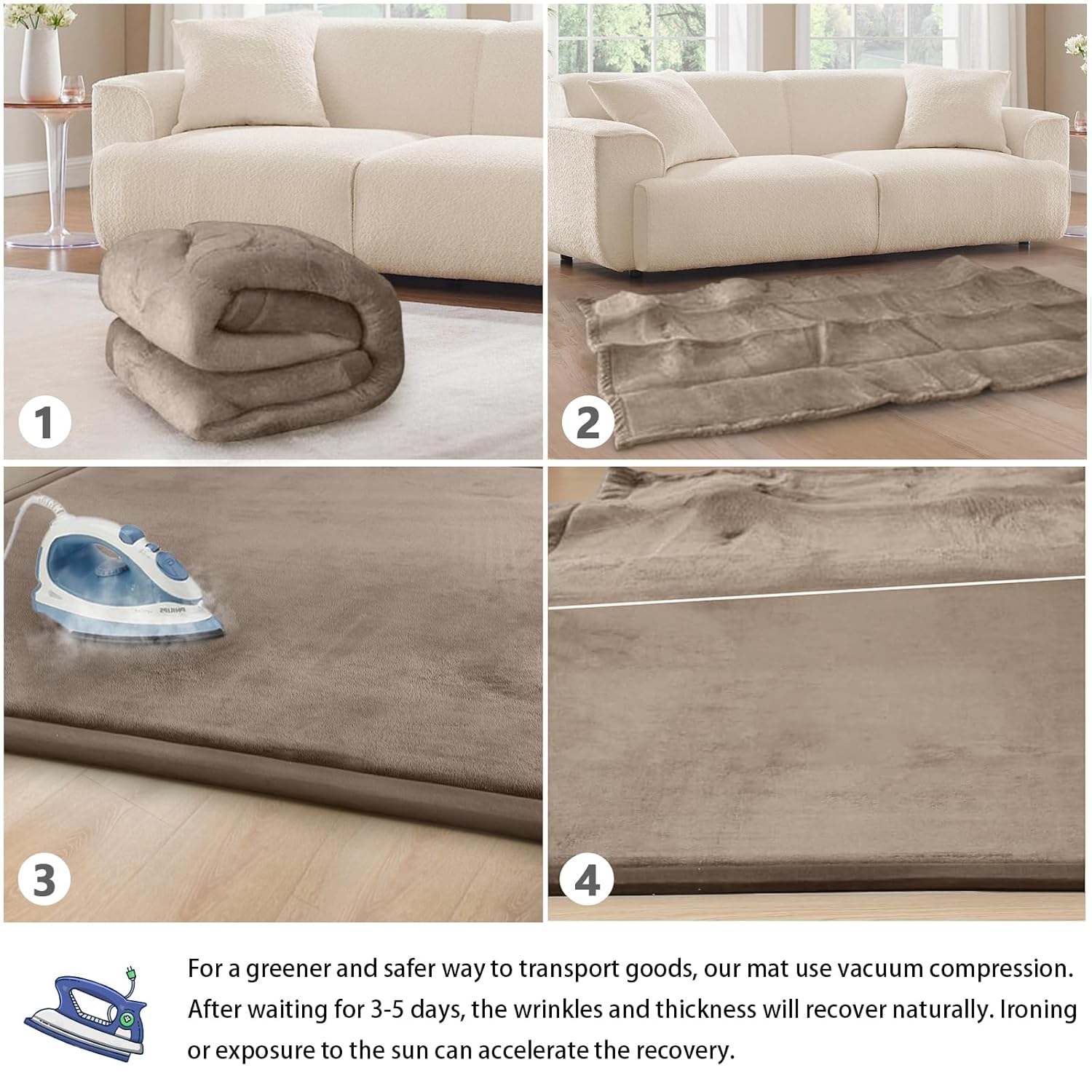 - 🌟HOW TO CARE FOR YOUR MAT:When you open the package,it may be wrinkled,very flat and inelastic.Don't fret - this is normal! As long as it is left for 3-5 days, the mat will naturally regain its thickness and elasticity. we recommend steaming or ironing it to speed up recovery. After you have completed the steaming/ironing, your thick floor padded mat should rebound and be ready to use!