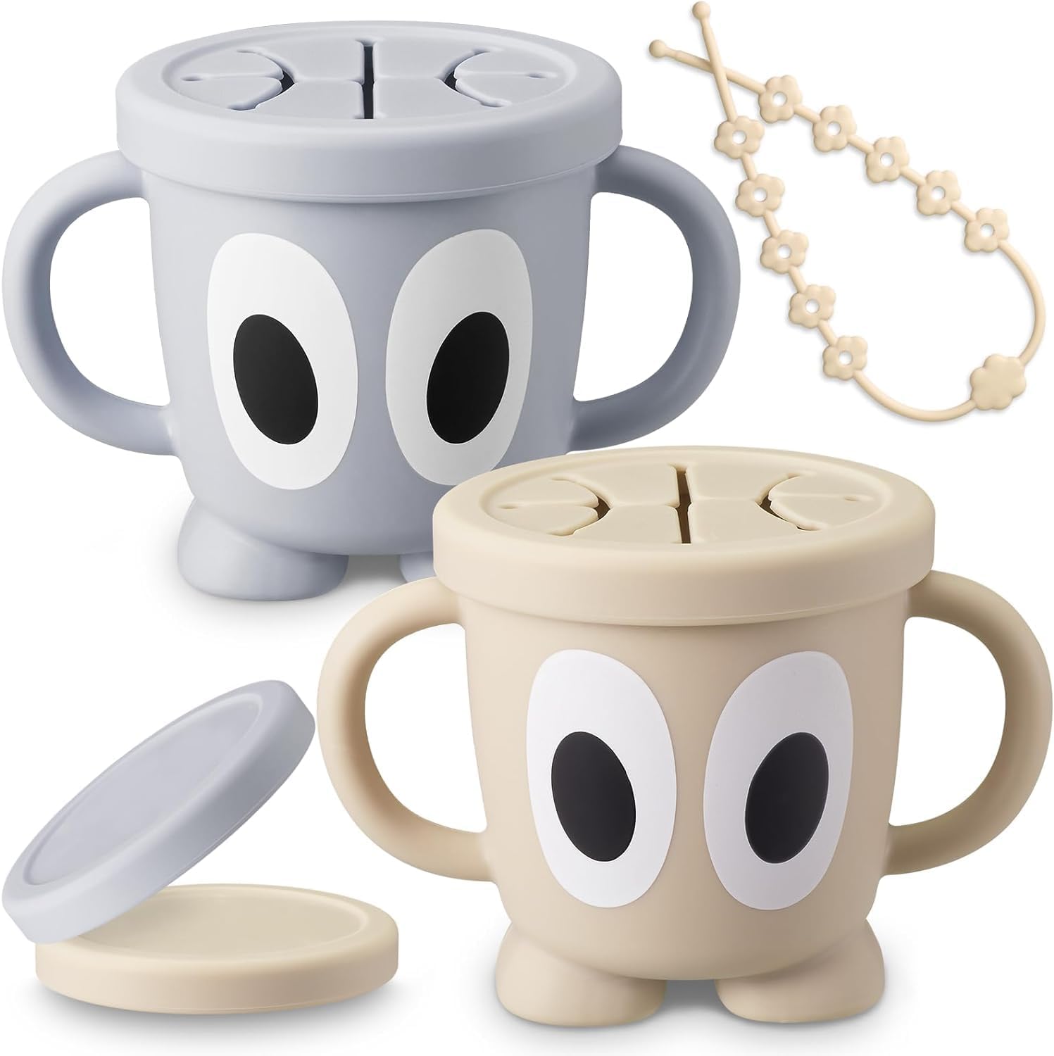Silicone Snack Cups Food Container for Toddlers and Babies, Spill Proof Training Cup with Snack Cup Lid & Dust Proof Lid, Comes with a toy strap, Without BPA, Lead, or Phthalates(Gray & Beige)