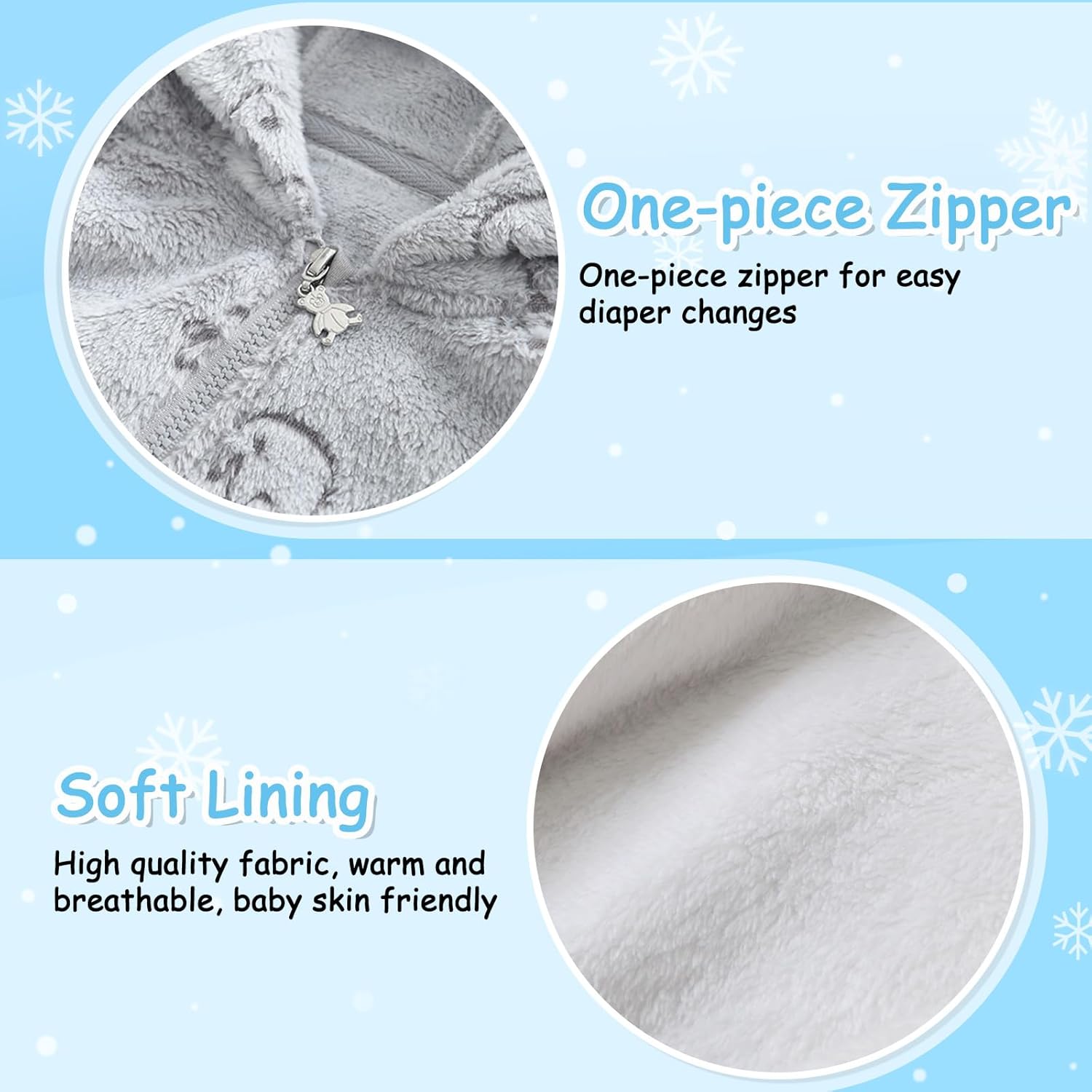 - đ»ăAttentive Designă The winter baby fleece hooded romper with cute bear ears and cartoon pattern makes your baby look adorable, exquisite and beautiful. The one-piece suit with full-length zipper design makes it easy to change diapers.