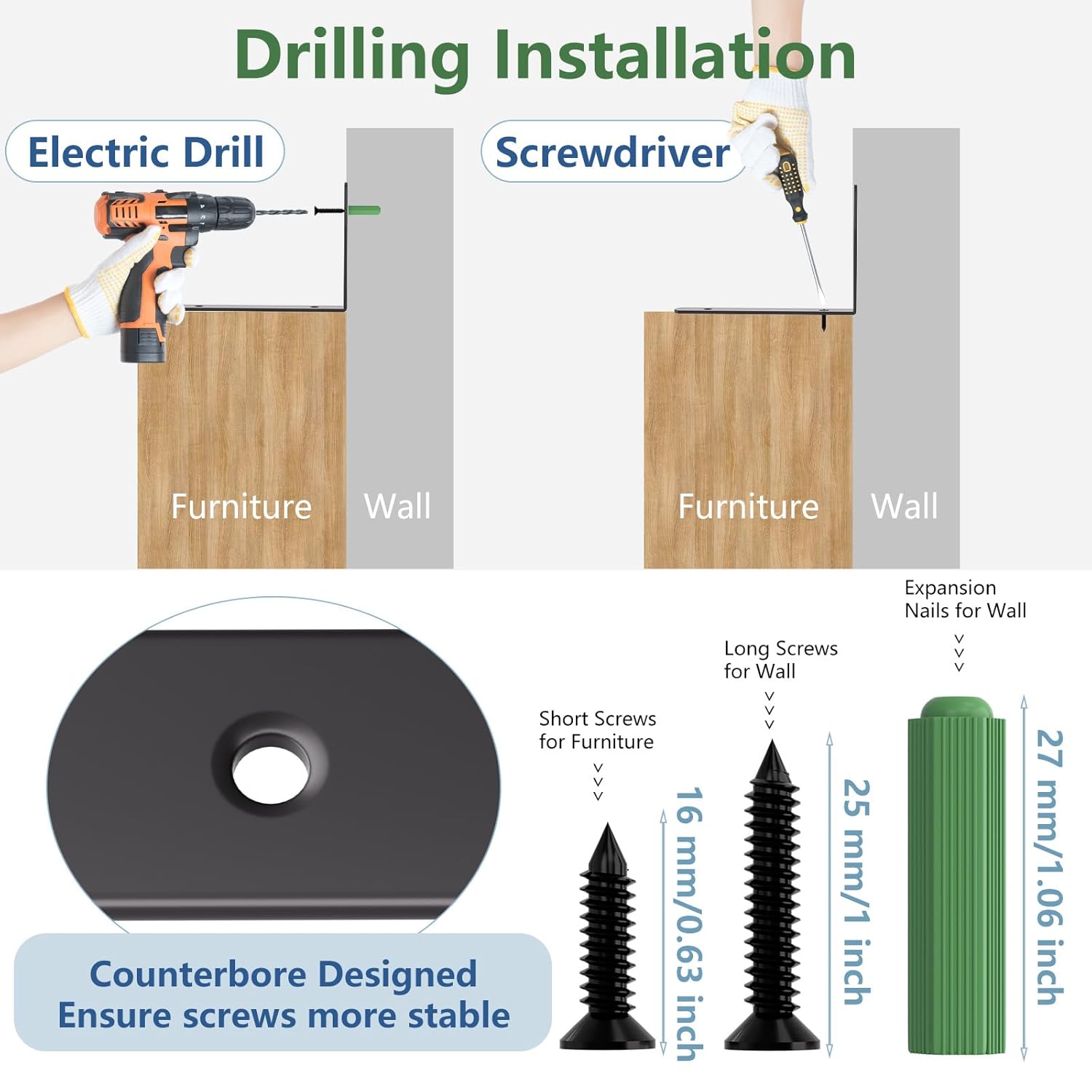 - [2 INSTALLATION WAYS]: The anti tip furniture anchors can be installed in two ways: drilled installation with strong fastening force for rough wall surfaces; no-drill installation using customised no-nail stickers, which have stronger adhesion without hurts to wall, more convenient to install and dismantle, suitable for smooth wall surfaces.