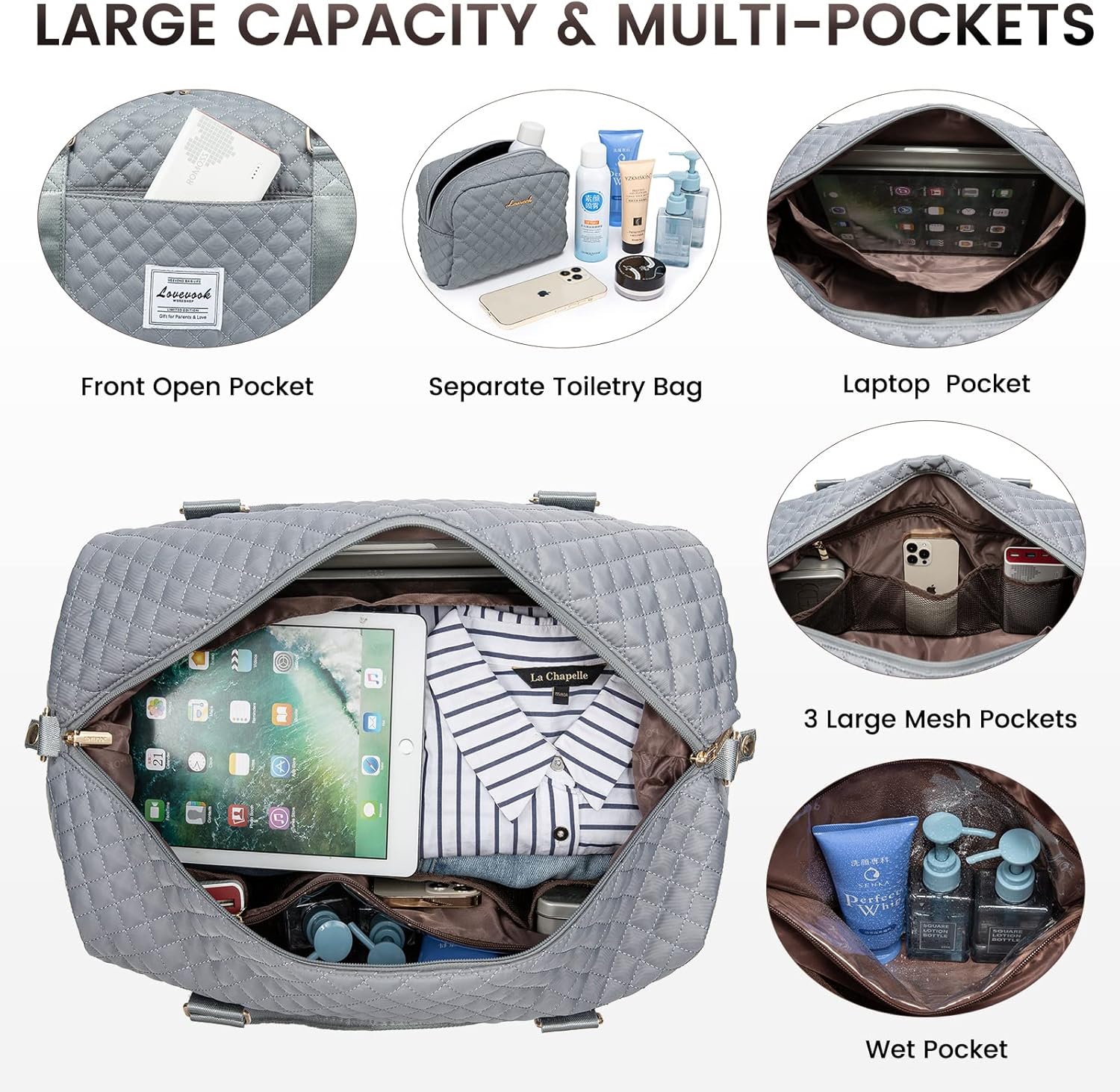 - 【STYLISH WEEKEND BAG & OVERNIGHT BAGS FOR WOMEN】This large duffle bag can even fit in 3-5 days of daily essentials. Multiple pockets to keep your personal items organized: a spacious main compartment with 5 big pockets for personal items and in the front of the duffle bag for travel, there is a pocket for easy access electronics or travel materials. Featuring with classy and gorgeous appearance. Our quilted duffle bag reach morden urban ladies greatest demand and fantasy on travel bag.