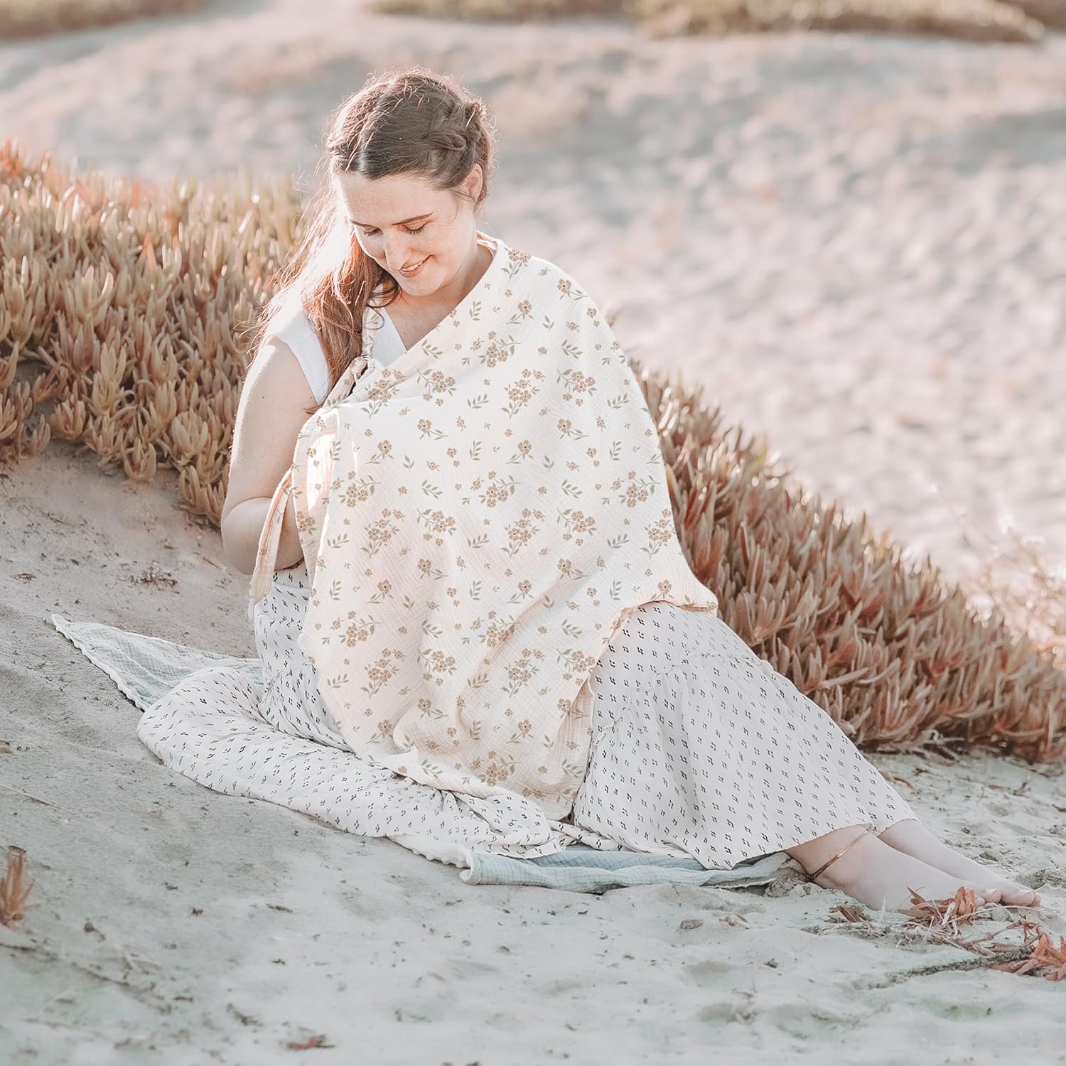 Konssy Muslin Nursing Cover for Baby Breastfeeding, Breathable 100% Cotton Breastfeeding Cover with Rigid Hoop for Mother Nursing Apron, Multi-use Carseat Canopy (Blossom)