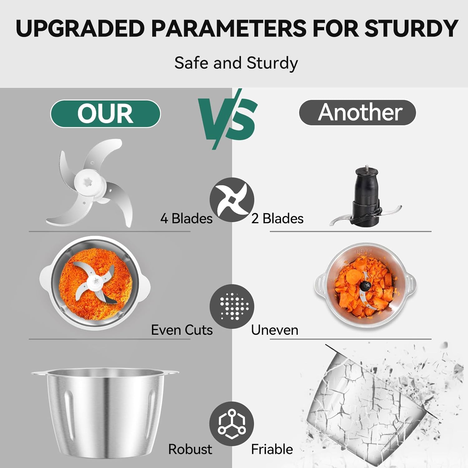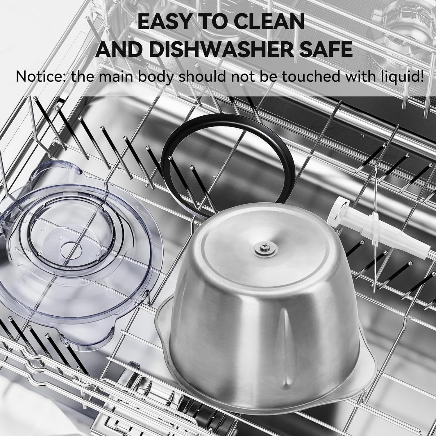 - 8 Cup Stainless Steel Food Chopper: This meat grinder electric with a 8 Cup bowl, can grind 2-4 lbs of meat at a time. Unlike glass bowl, it is lighter and stronger, with better shock resistance and durability. It can be washed by dishwasher, also can be sterilized at high temperature