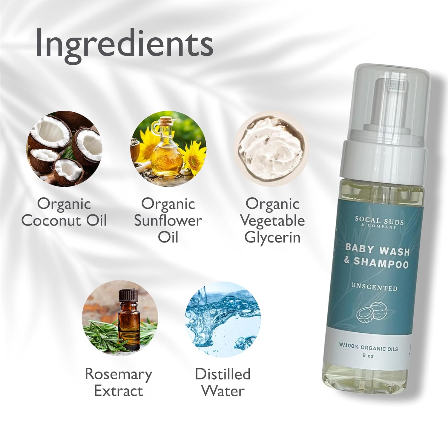 - GENTLE CARE IN EVERY BUBBLE: SoCal Suds & Company's foaming organic baby wash and shampoo features saponified oils of organic sunflower and coconut. This gentle formula is enriched with distilled water, organic vegan glycerin, and rosemary extract, offering a nurturing cleanse that honors the delicate balance of any skin type. Embodying our commitment to natural and organic care.
