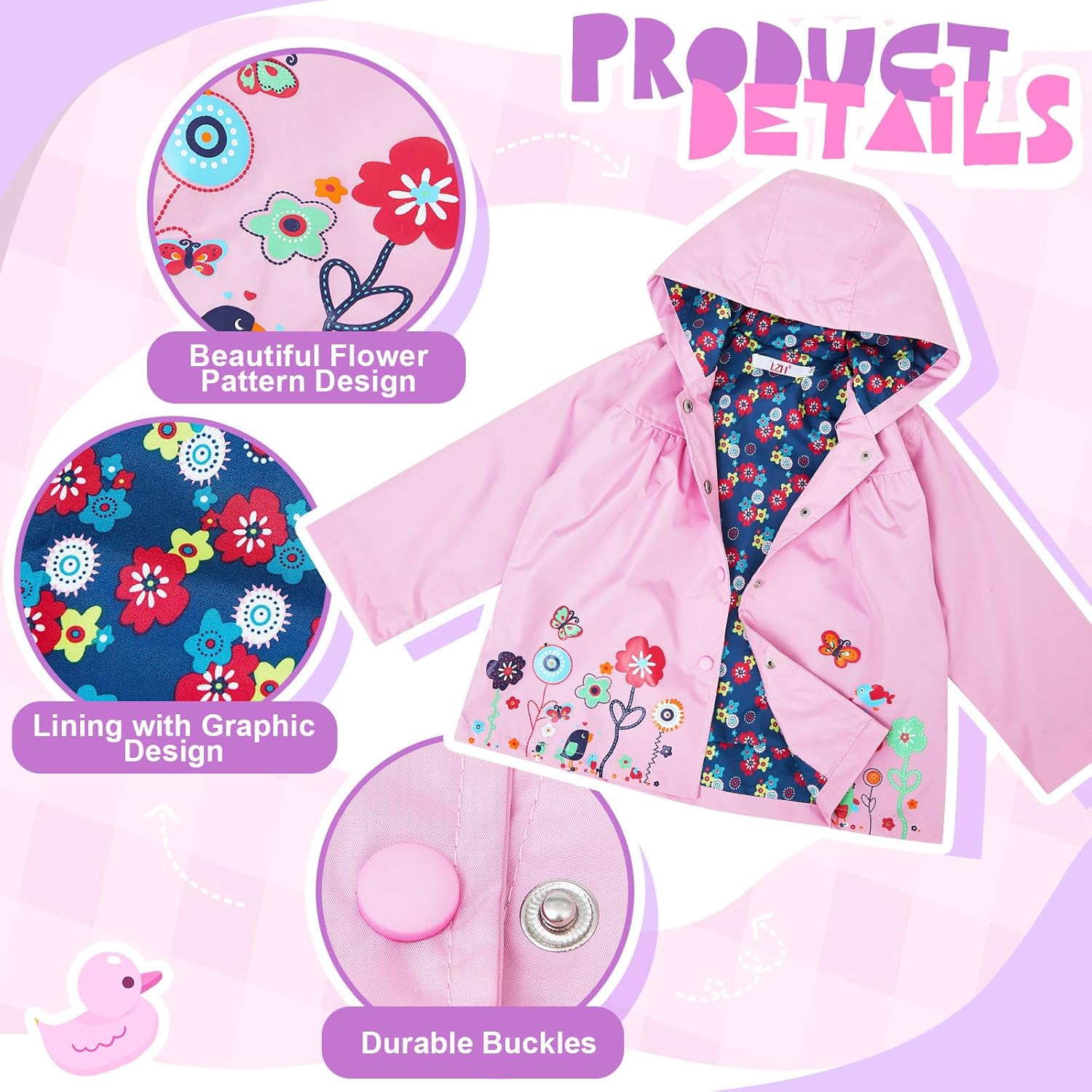 - Adorable Design and Color: our pink raincoat has a lovable flower design that adds a cute touch; The raincoat is lovely and active, and will make your toddler gets excited about wearing their raincoat