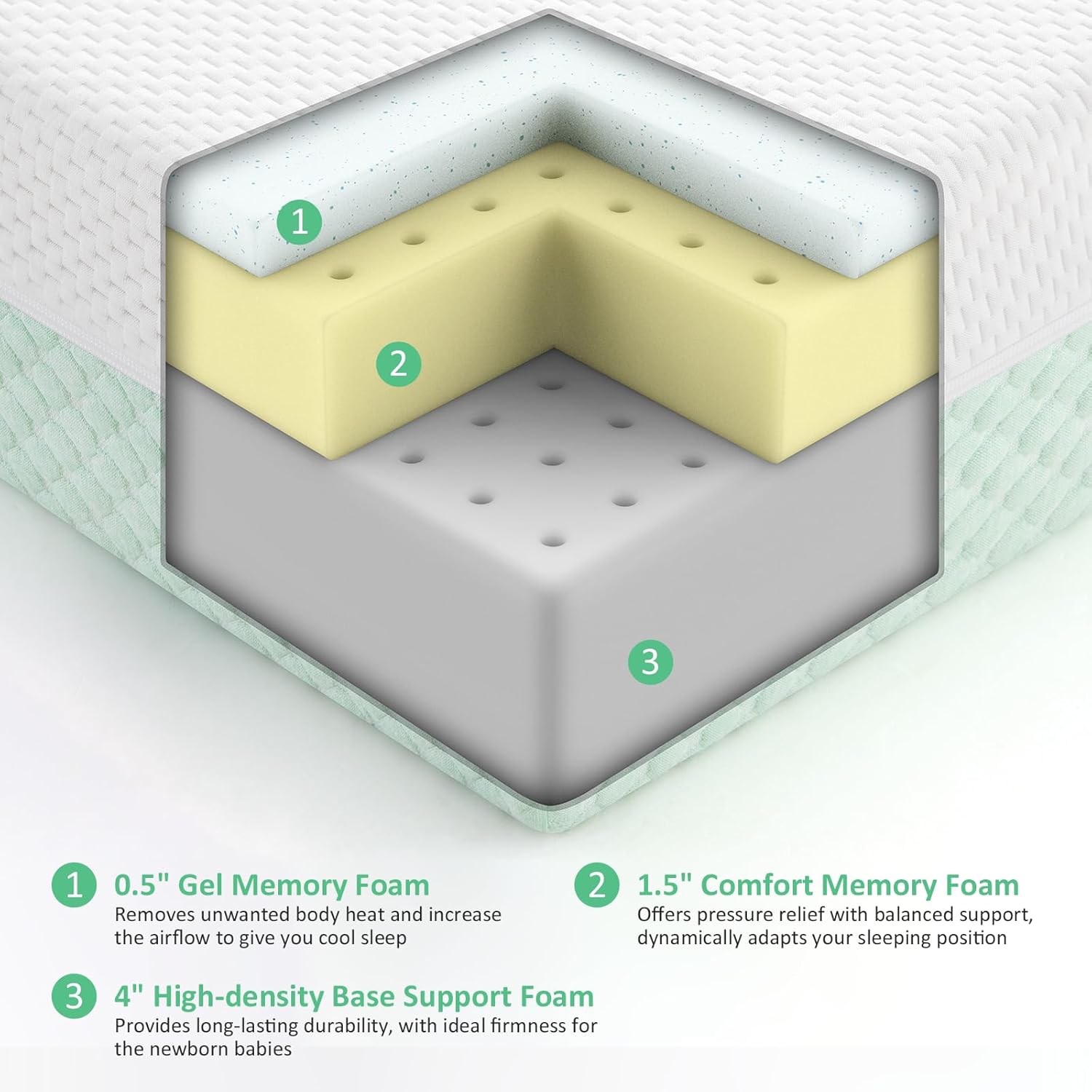 - 【Breathable & Comfortable Mattress】 Integrated with Gel-infused memory foam, open-cell memory foam and high-density support core, the triple-layered mattress helps to regulate temperature by accelerating air circulation and transferring unwanted heat away from the body, giving your baby a cool and comfortable sleep environment, thus ensures a through-the-night sleep