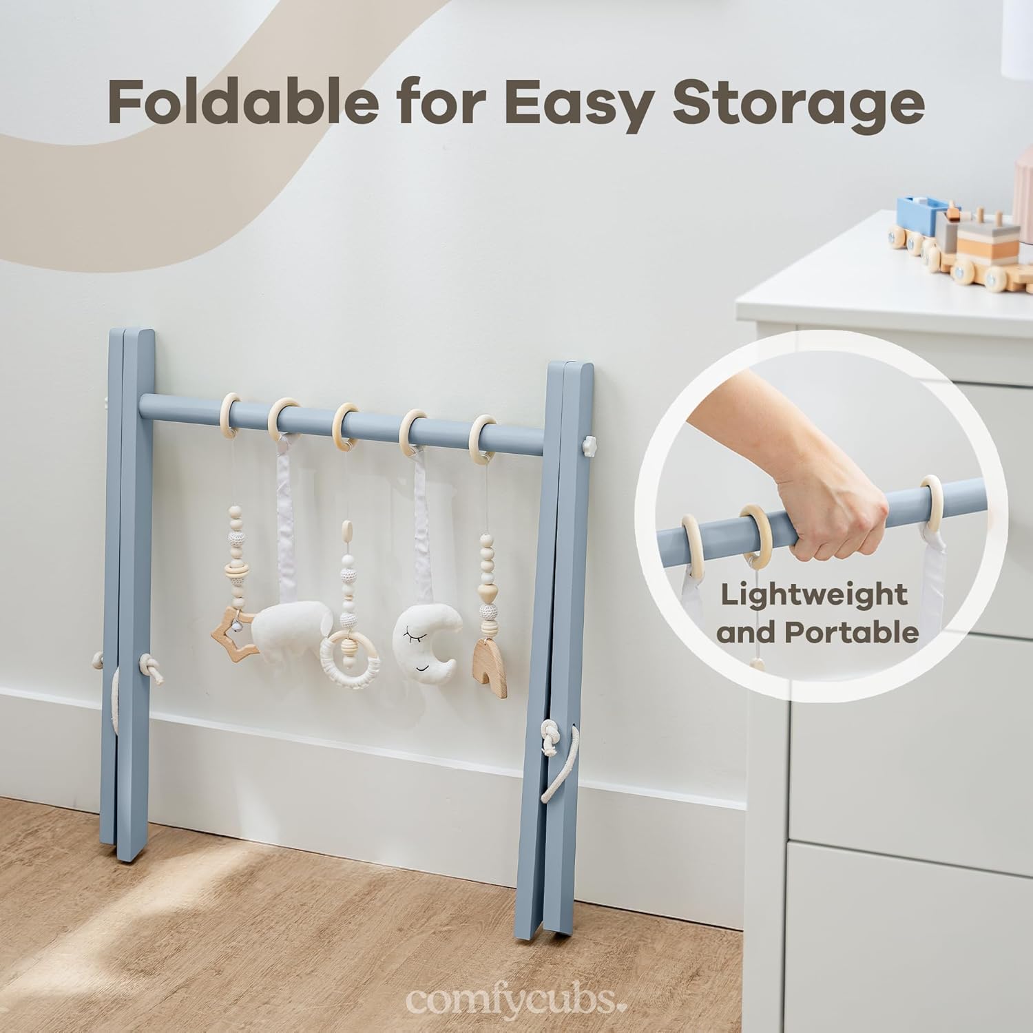 Comfy Cubs Wooden Baby Play Gym - Natural Finish Pinewood Baby Activity Gym with 5 Sensory Hanging Toys - Easy No-Tool Assembly, Safe and Durable for Infant Motor and Visual Development - Pacific Blue