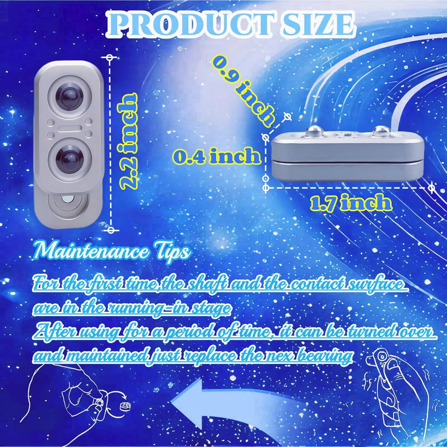 - “Diverse Gameplay”--You can push slider up and down. When push the top metal body to the top of the bottom metal body can unlock the rotation function. Toggle the top metal body with your finger and the top metal will start to rotate around the bottom metal because of the internal rotating bearing. One end can rotate quickly while the rotation of the other end will be clearly felt as an interesting magnetic effect.Eyeballs can be clicked and pressed and make a rhythmic clattering sound.