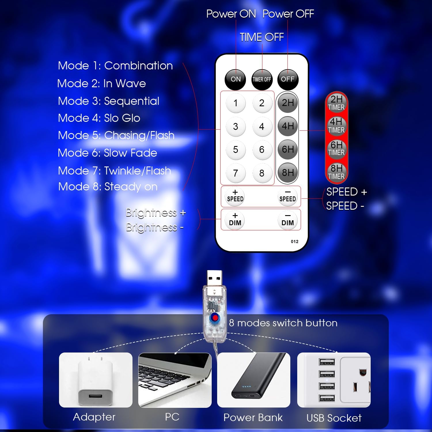 - Timer & 8 Lighting Modes: Newly upgraded timing function, fairy lights allowing you to directly select timing of 2H, 4H, 6H, 8H through the remote control, more flexibly meeting your usage needs in different scenarios; With the remote control, you can easily turn on and off the lights, control the brightness, and adjust the lighting mode. Make it the perfect embellishment for your home decoration.