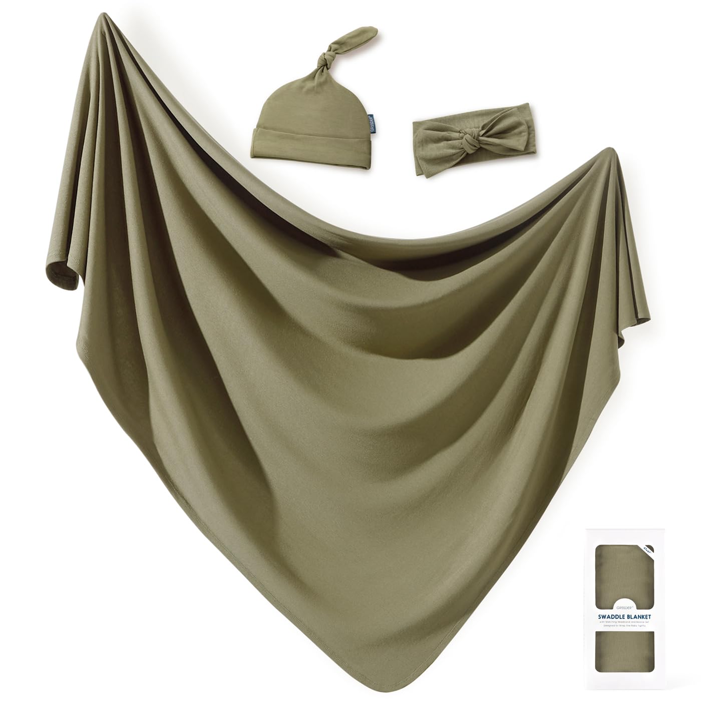 GRSSDER Newborn Swaddle Blanket, Ultra Soft Jersey Receiving Blanket with Matching Headband and Beanie Set, 47×47" Extra Large Nursery Swaddle Wrap for Girls and Boys