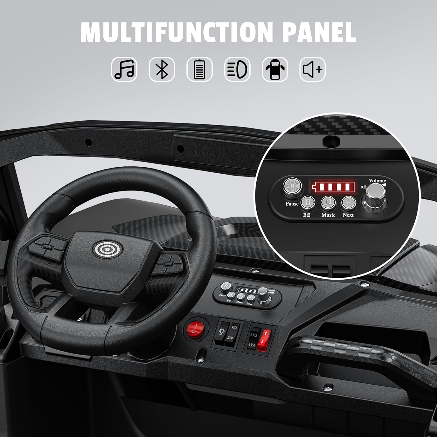 - [Colorful Rear Lights & Music Player] Equipped with three unique colorful rear lights, it makes the kids feel like riding in a rainbow. And the shining front lights inlaid with many small light beads make this 24v ride on UTV look super cool! When riding at night, these dazzling lights also play a role in safety. In addition to the built-in music, parents can also connect their mobile phones via Bluetooth to play their kids' favorite music and stories. Let the kids start every fun ride with their favorite BGM.