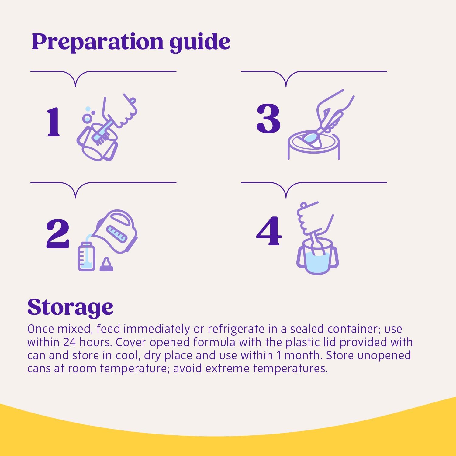 - PREPARATION: Wash hands, cup & utensils before preparing drink. To make 1 serving, add 3 level scoops of powder to 6 fl oz of warm water into a clean cup. Stir, whisk, or shake until powder dissolves. Test temp (lukewarm not hot), on wrist before serving