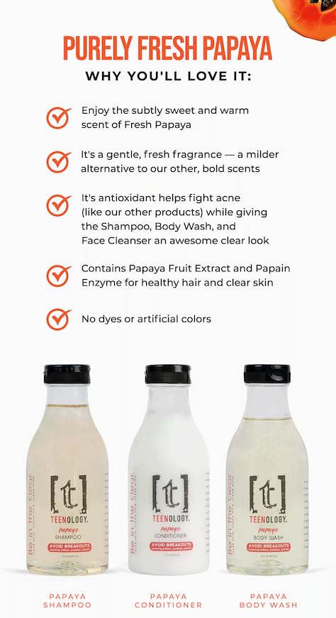 Teenology Conditioner for Teens - Avoid Forehead and Body Acne - Sulfate and Paraben Free, Noncomedogenic, Natural Botanical Extracts, NEW Fresh Papaya - 16 oz.