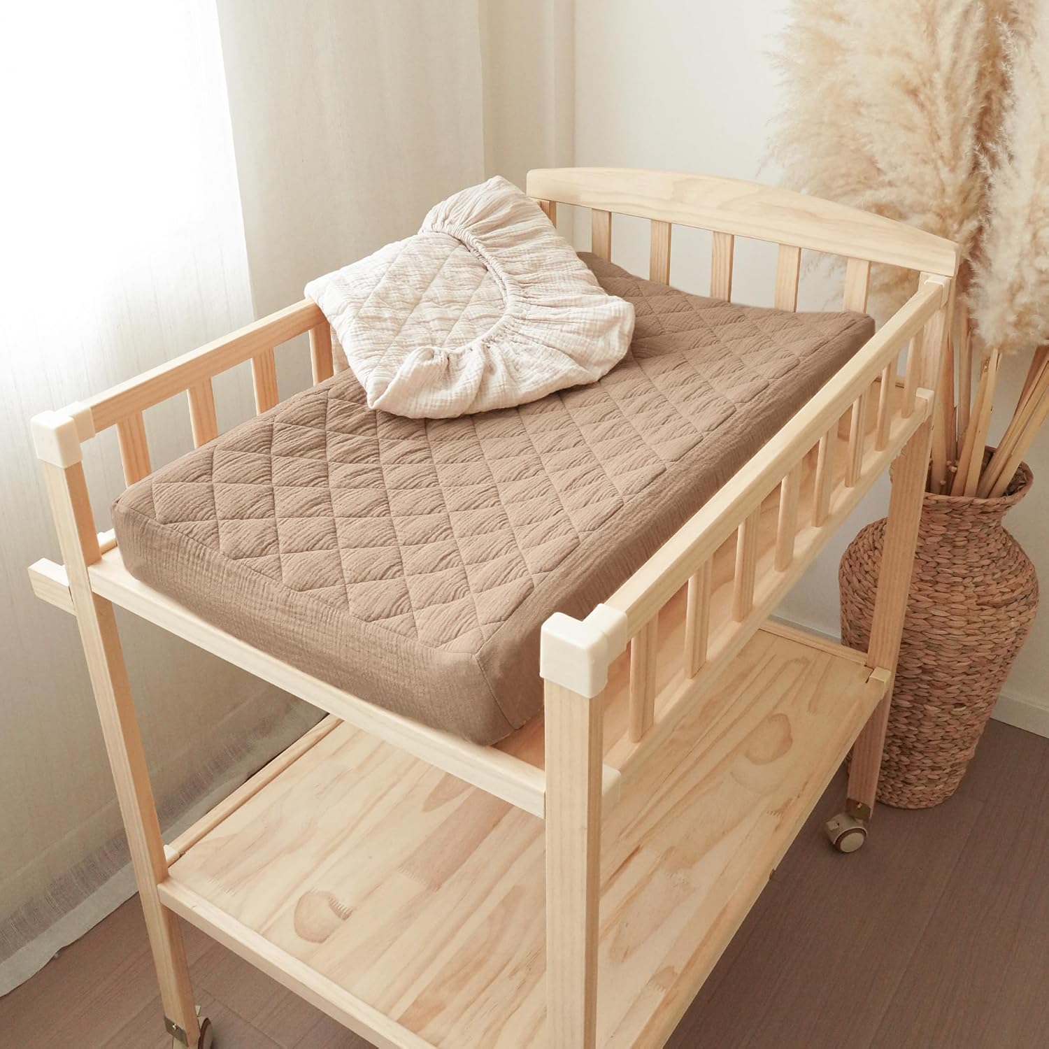 Konssy Waterproof Muslin Changing Pad Cover 2 Pack, Quilted Cotton Fitted Diaper Changing Table Cover, Soft Changing Pad Sheets for Girls Boys (Brown, Cream)