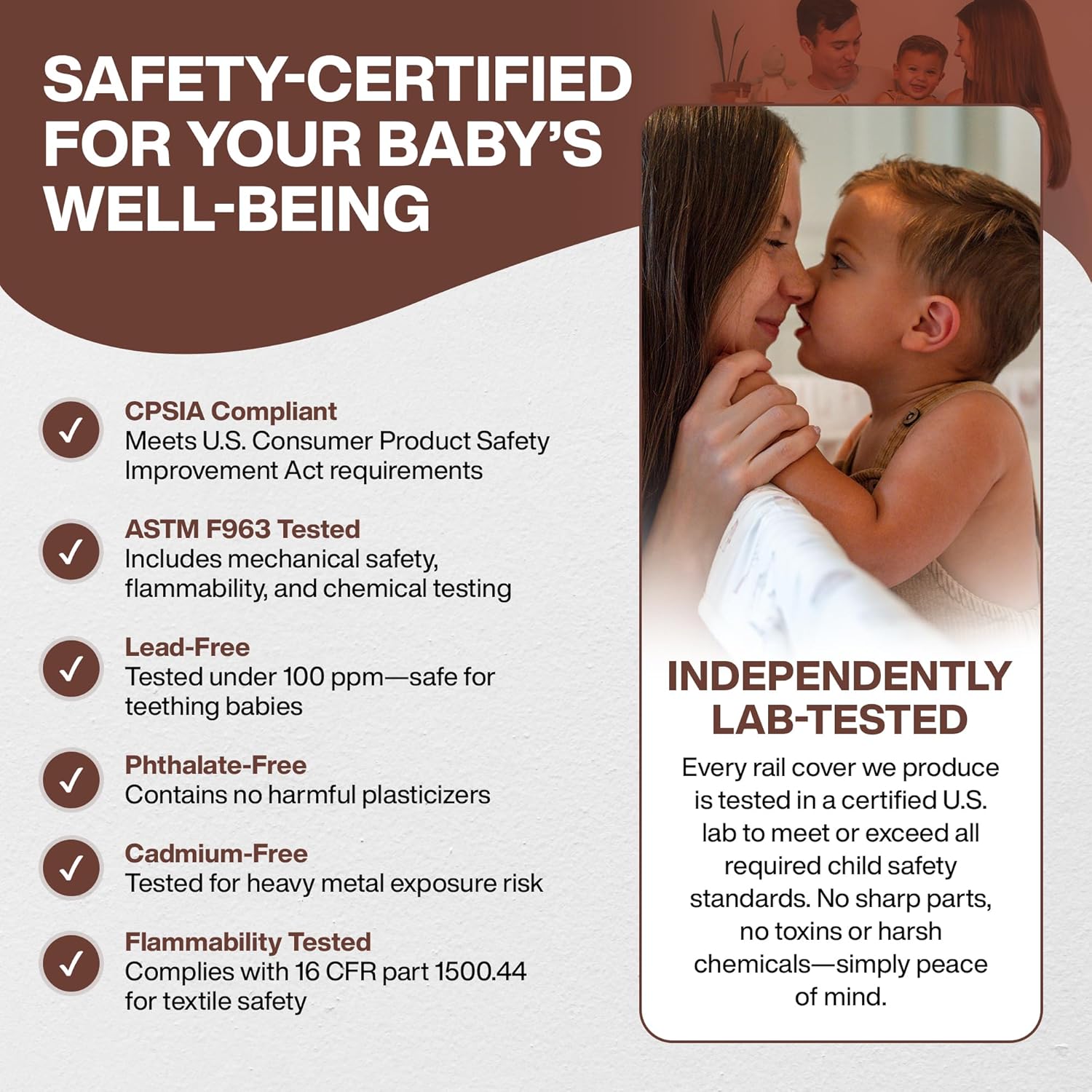 - LAB-TESTED SAFE FOR BABIES: Independently tested to meet U.S. safety standards (CPSIA & ASTM F963), our cotton crib rail guards are free from heavy metals like lead and cadmium, and contain no added phthalates or harmful chemicals. Thoughtfully designed for peace of mind—no sharp parts, no added harmful chemicals, just clean, baby-safe materials.