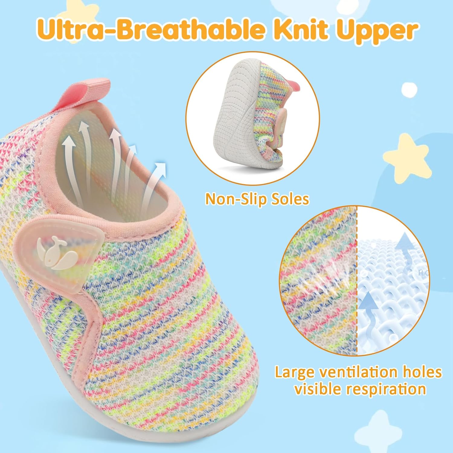 - Breathable and comfortable:Knitted Mesh Upper offers comfort and air permeability.Keep your child away from foot smelly.Also,high-quality upper provides good ductility to support children's active walking, running,and playing