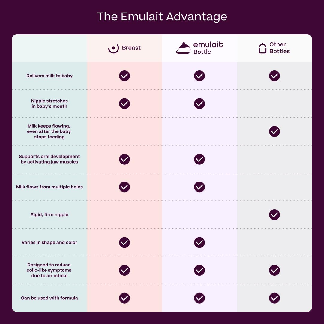 - Nurturing Breast-to-Bottle Transition: Designed to minimize nipple confusion and encourage prolonged breastfeeding, Emulait bottles offer a harmonious blend of comfort and oral development benefits. Say goodbye to preference issues as our biomimetic system ensures smooth transitions.