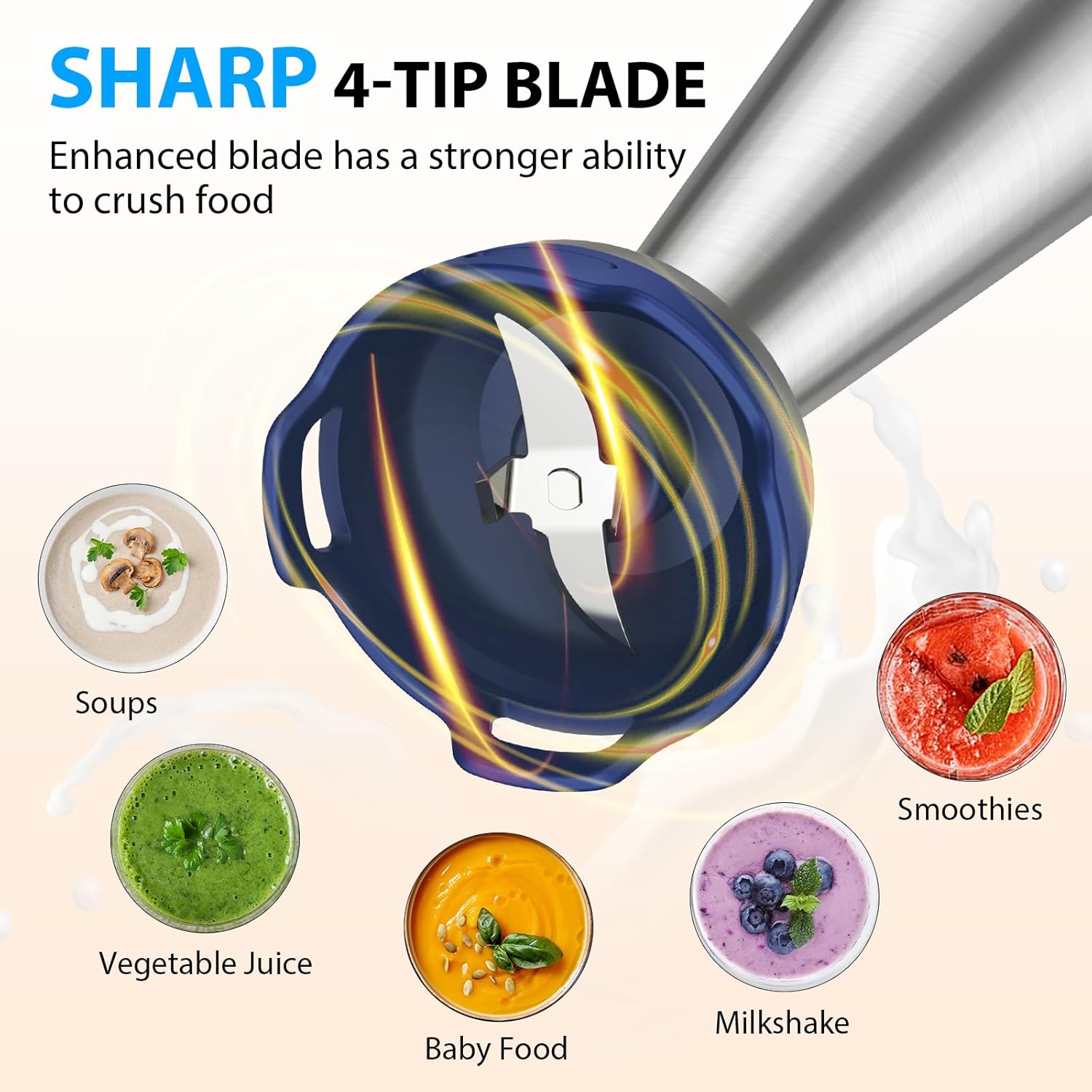 - 1000W Motor & 304 Stainless Steel 4-tip Blade: Compared with other 300-500W motors, upgraded KOIOS handheld blender is equipped with a 1000W all-copper motor, which is more powerful and has a stronger ability to crush food. With 304 food-grade stainless steel blades, this material has good oxidation resistance and high temperature resistance. Safe to use even in hot soup.