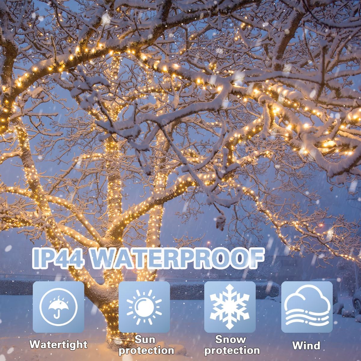 - Waterproof Outdoor String Lights: Our 200 LED waterproof string light has passed IP44 waterproof certification, it can resist water, perfect for indoor outdoor decorations, don't worry about using it in heavy rain and heavy snow, but warm tips please protect the plug.