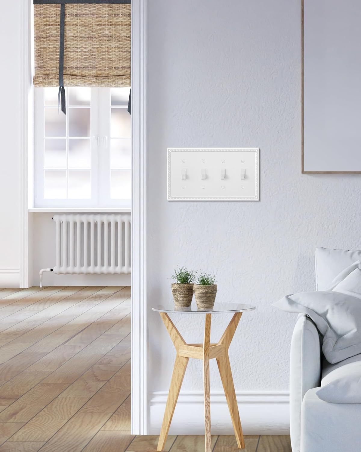 - Timelessly Elegant - The quad light switch plate covers feature an exquisite pure white finish with a traditionally styled beaded border. Offering a functional yet elegant enhancement to your home decor. Stylish wallplate effortlessly blends practicality with a refined decorative accent and sophisticated charm.