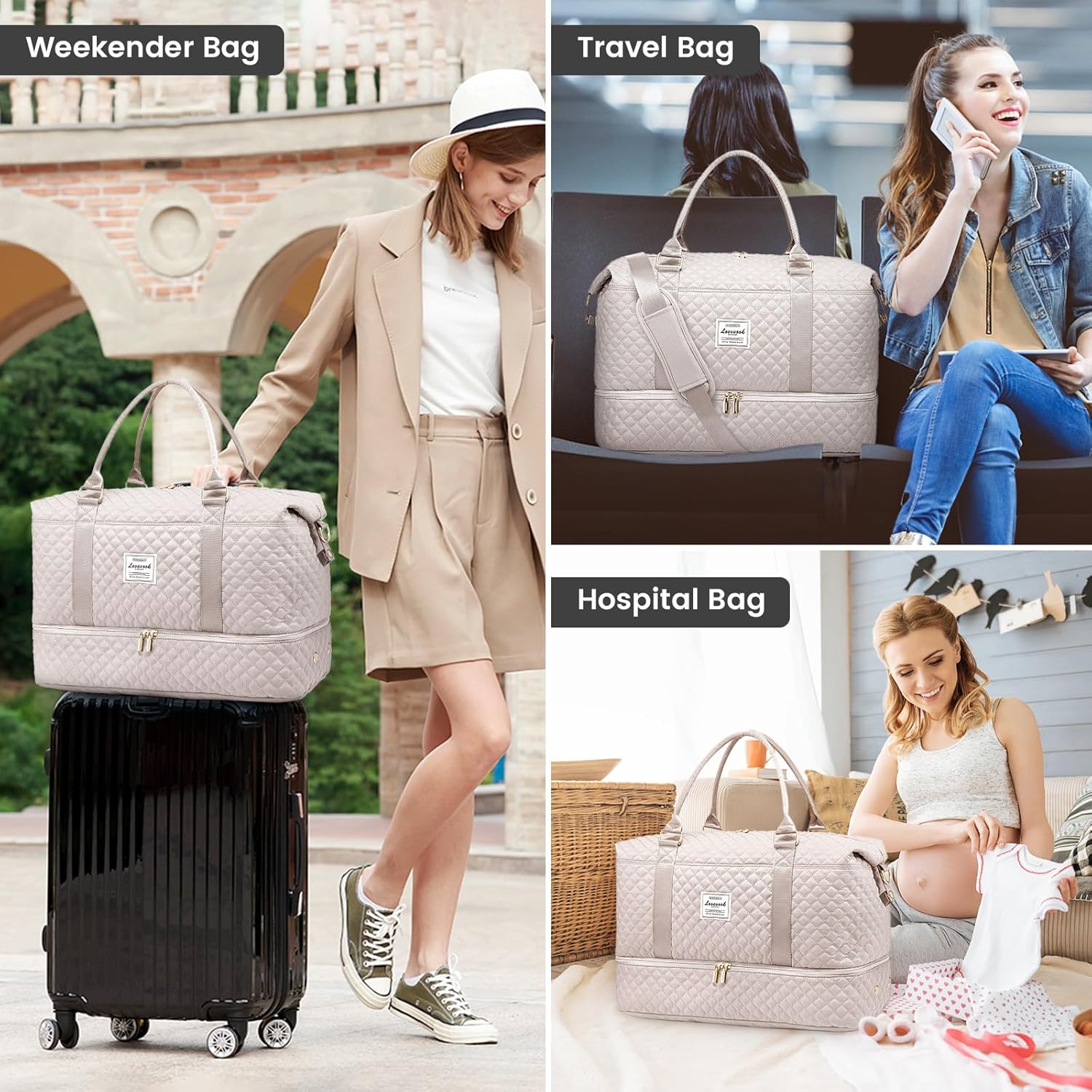 • 【TRAVEL TOTE BAG WITH SHOE COMPARTMENT+FREE SEPERATE TOILETRY BAG】This travel bags for women comes with a $15 toiletry bag to store your cosmetics/toiletries. Separate flat bottom compartment of this duffle bag women can hold your shoes or dirty clothes for easy separation from clean clothes when traveling.If you're a novice mother, the bottom part is also perfect for storing diapers/wipes/diaper bag items. It can also be used as a hospital bag,mommy bag and medical bag.