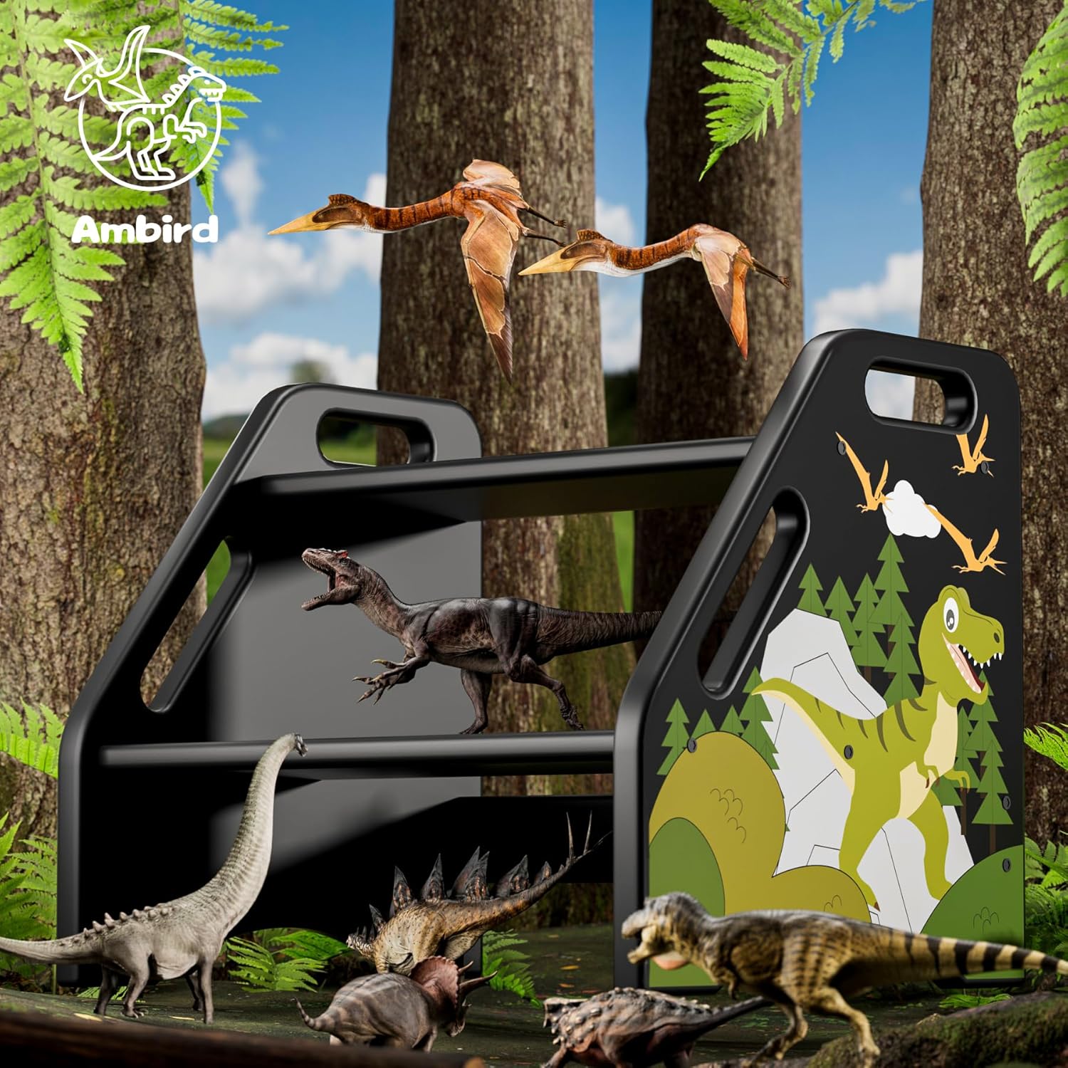 AMBIRD Toddler Step Stool, Dinosaur Wooden Two Step Stool for Kids with Non-Slip Pads, Portable Potty Training Stool with Handles for Bathroom, Sink, Kitchen, Bedroom