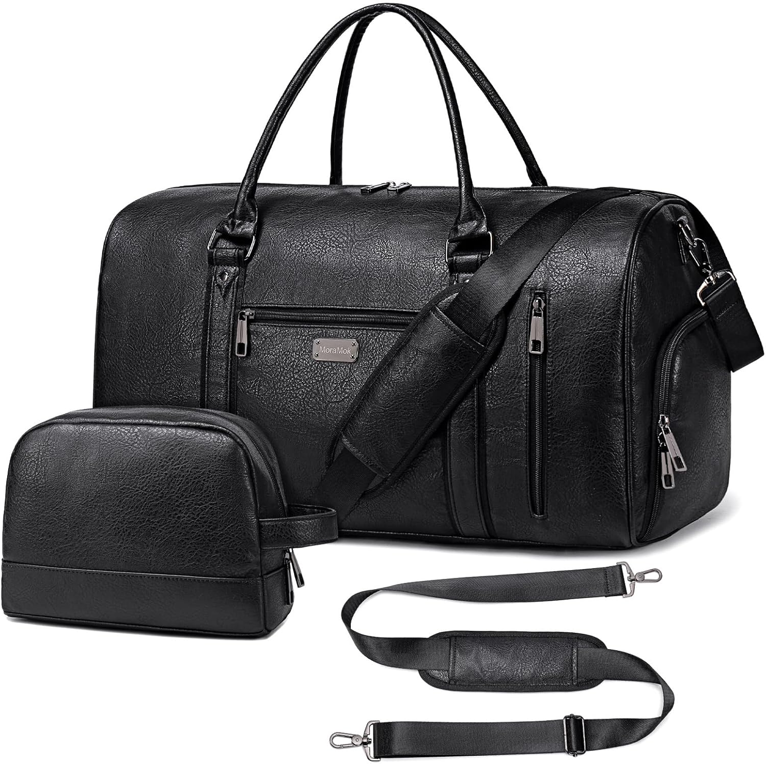 - Large capacity & multiple pockets Weekender Overnight Bag with Portable Toiletry Bag: The leather travel duffel bag has 1 roomy main double zippered pocket with 8 inner pouches for clothes, towel, socks, laptop, books, electronics. 2 front deep zipper pocket, 1 side zipper pocket and 1 back zippered pocket on luggage sleeve for quickly grabbing your phone, wallet, keys, passport, ticket, etc. Besides, A extra portable waterproof toiletry bag with 3 pockets inside can perfectly store your toiletries, cosmetics, personal daily care tools and small personal items, etc.