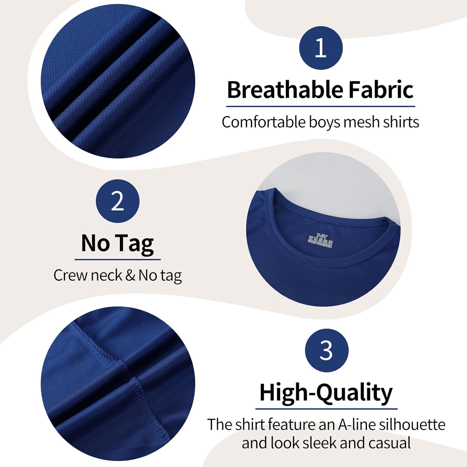 • The boy's quick dry t-shirts made with 100% polyester, crafted from moisture-wicking, soft, and lightweight fabric