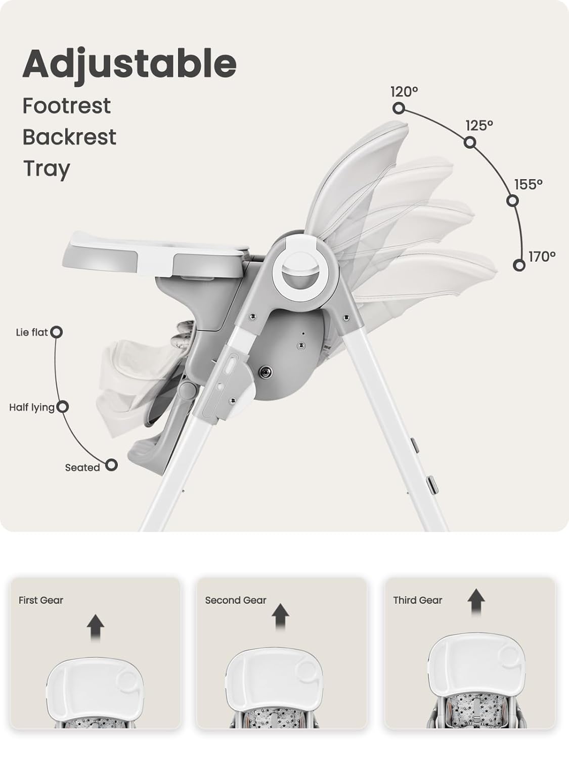 - Fully Adjustable Design: Customize for your baby's comfort with a 3 level footrest, 4 position reclinable backrest, and 3 position adjustable tray. Both the tray and footrest adapt as your child grows.