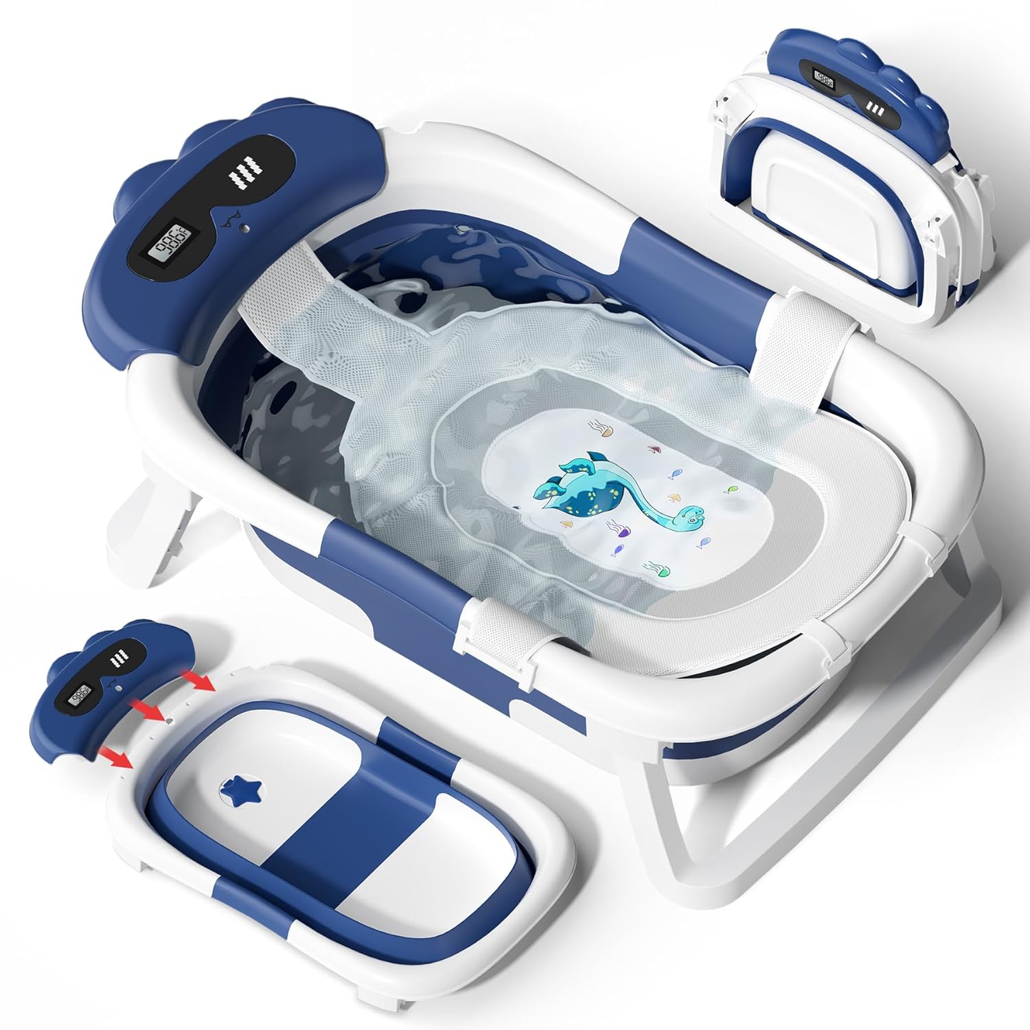 AVIDOR Baby Bathtub,Collapsible Bathtub for Newborn to Toddler,Durable Essential Infant Bath Tub,Portable Travel Baby Tub with Soft Bath Net,No-Slip Feet and Dinosaur Shaped (Navy Blue)