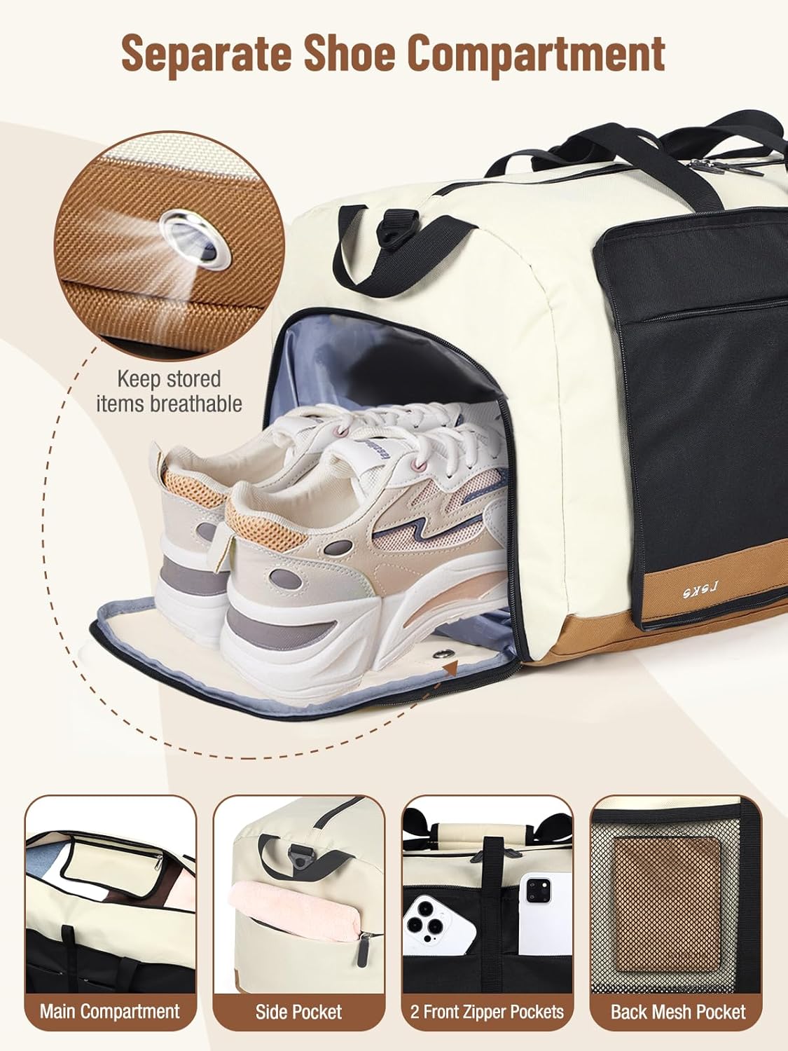 Lekesky Foldable Travel Duffle Bag for Women, Large Duffel Bag with Separate Shoes Compartments & Straps, Carry On Weekend Bag for Women, Hospital, Overnight (Camel & Brown, 80L)
