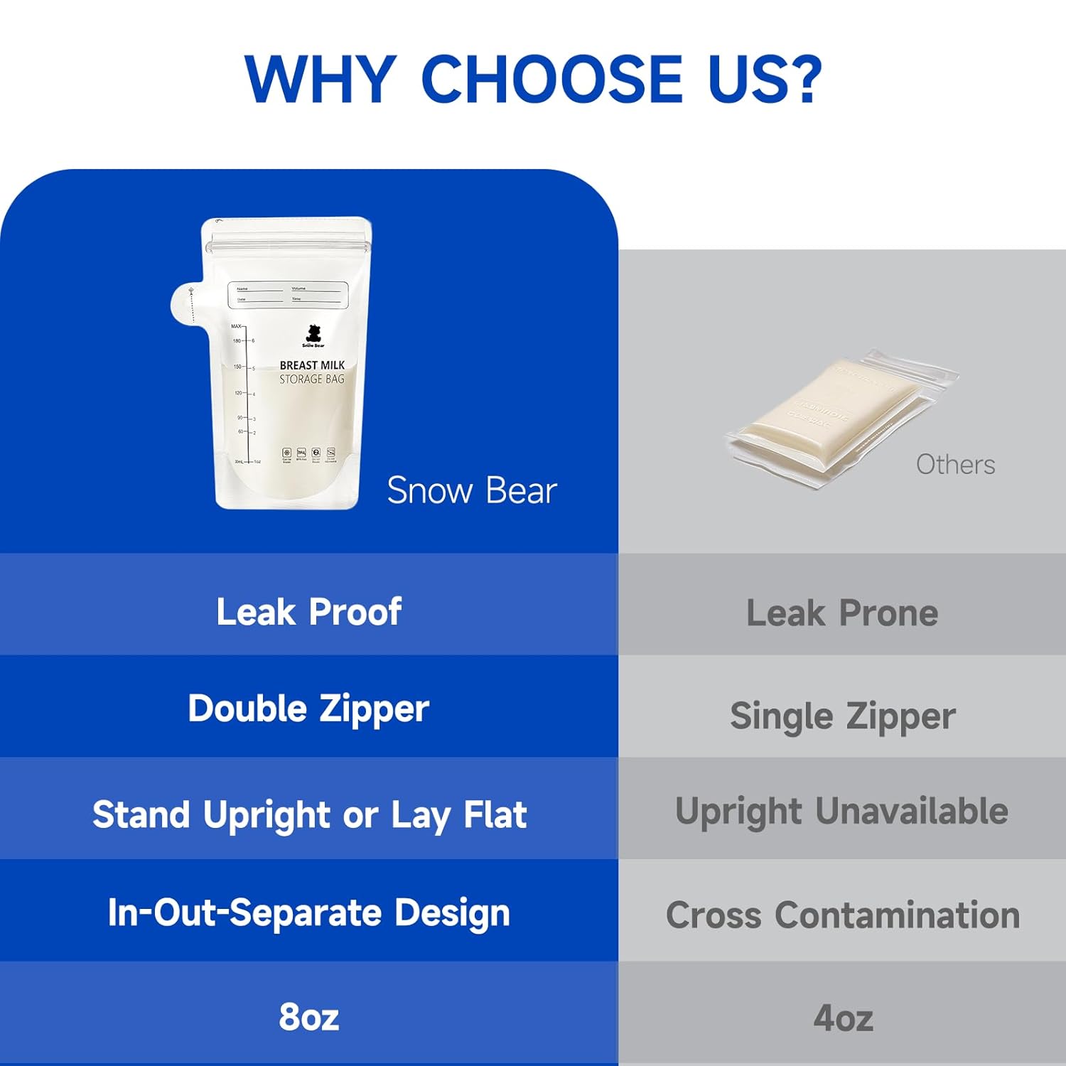 Snow Bear 8oz Breastmilk Storage Bag, 120 Count Breast Milk Storage Bags for Freezer, Double Zipper Milk Bags for Breastmilk