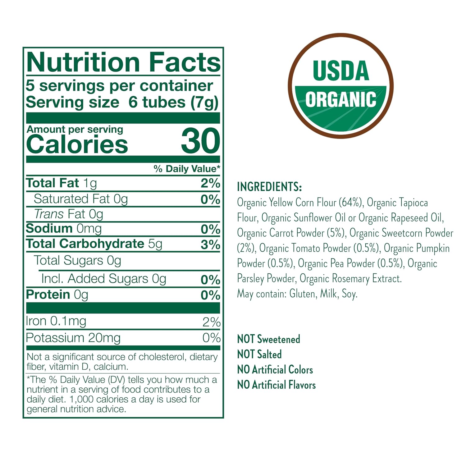 - Organic mixed veggie & corn tubes baked for a crunchier texture, introducing intrepid little adventurers to sensory explorations with new fun shapes & colors.