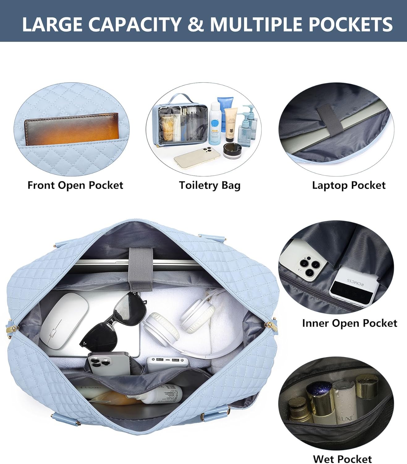 Travel Overnight Bag Weekender Bags- Duffle Bags Women with Shoe Compartment Carry on Overnight Bag with Toiletry Gym Duffel with Wet Pocket Hospital Bags Light Blue