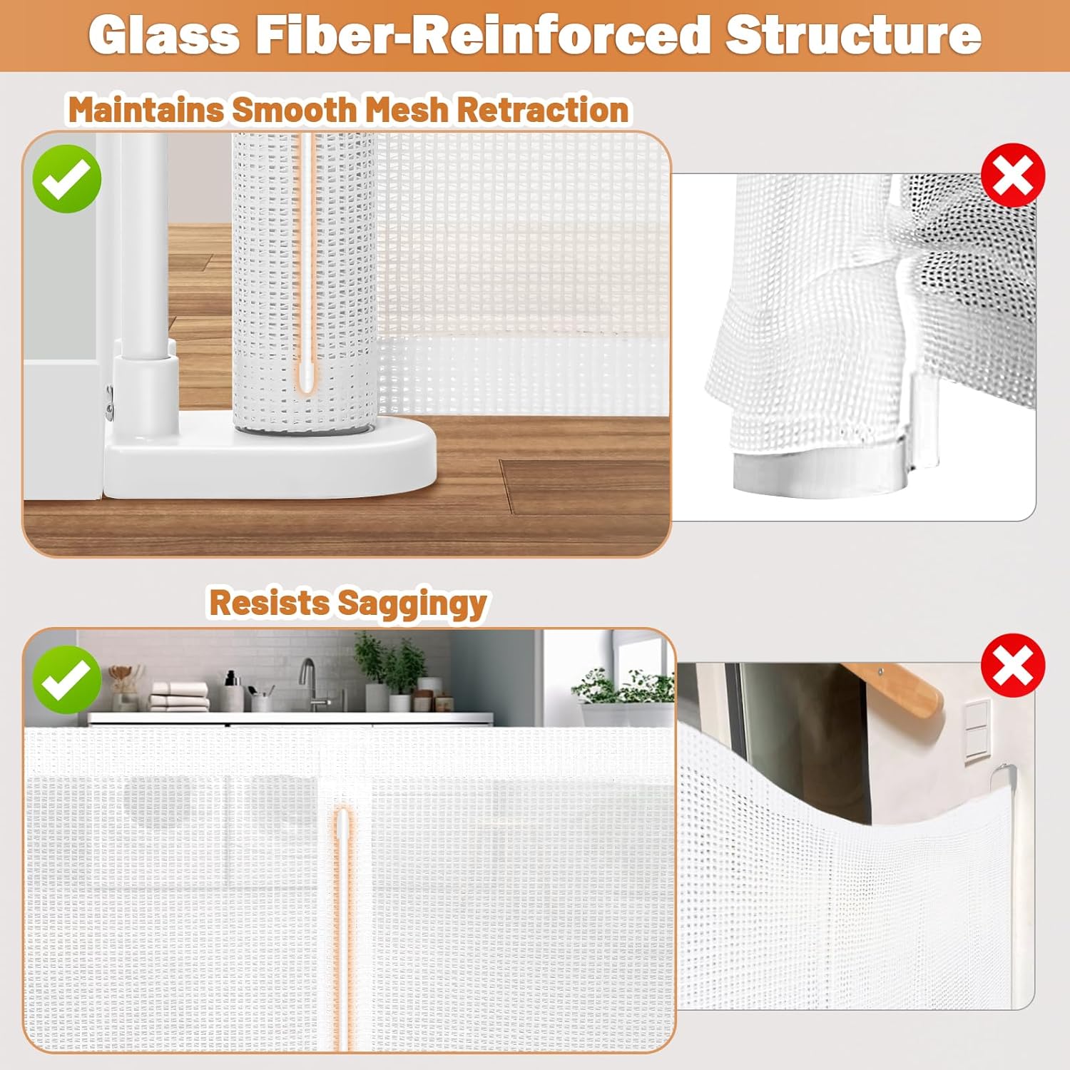 - 【Fiberglass Support】We have upgraded the retractable gate with fiberglass support strips, which prevent kids and pets from going under the mesh and reduce wrinkling. The mesh expands smoothly without getting stuck, making it effortless to use.