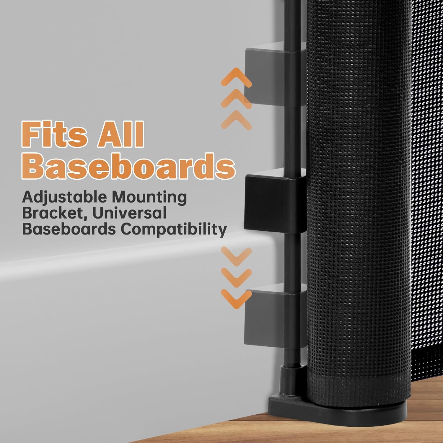 - 【Fiberglass Support】We have upgraded the retractable gate with fiberglass support strips, which prevent kids and pets from going under the mesh and reduce wrinkling. The mesh expands smoothly without getting stuck, making it effortless to use.