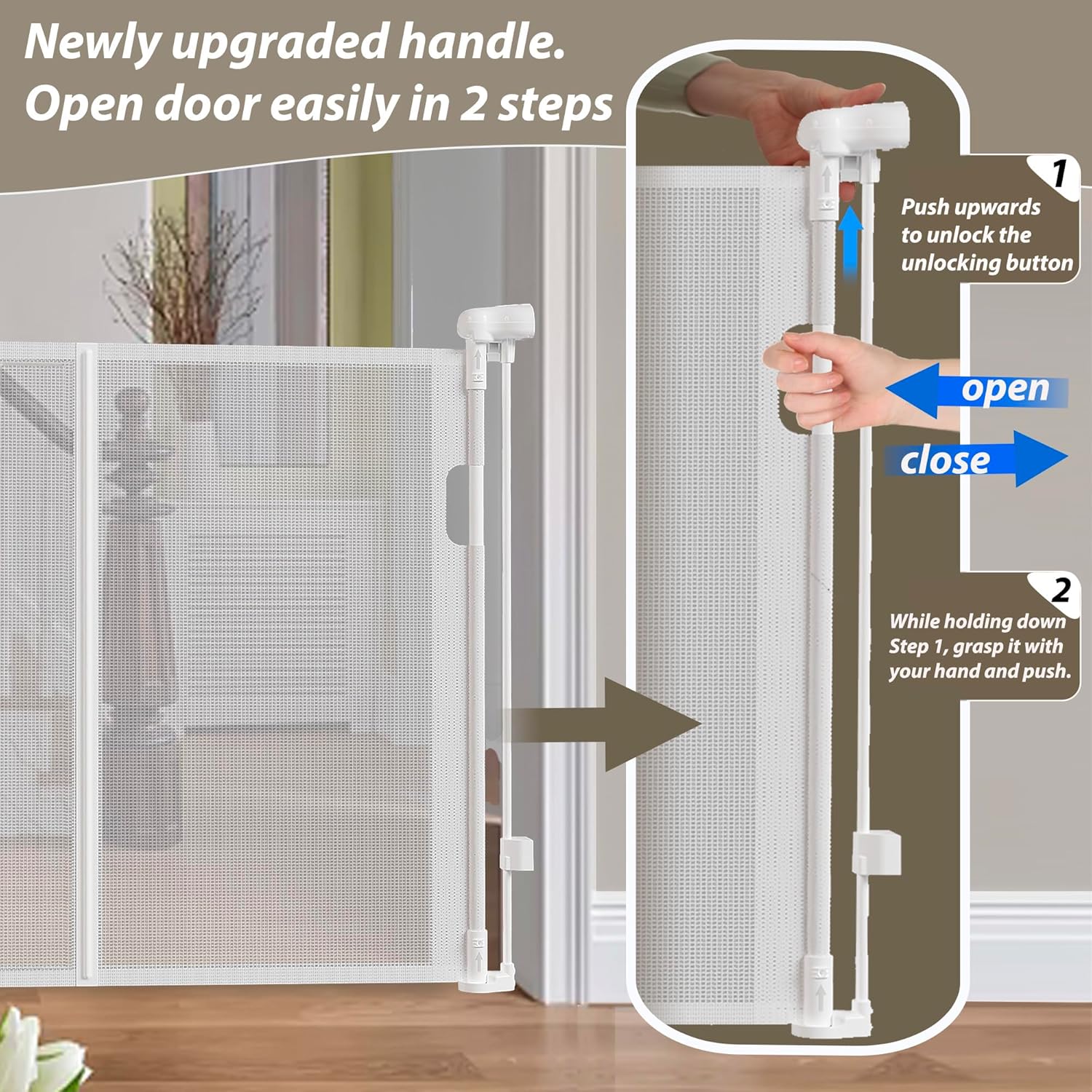 - Safety Double Lock Design - The retractable gate features two locking mechanisms: a mesh lock that controls the mesh's extension and retraction, and a hidden door lock for opening and closing the gate. Designed for adult convenience, it remains particularly challenging for children, effectively preventing them from opening the door alone and accessing hazardous areas.