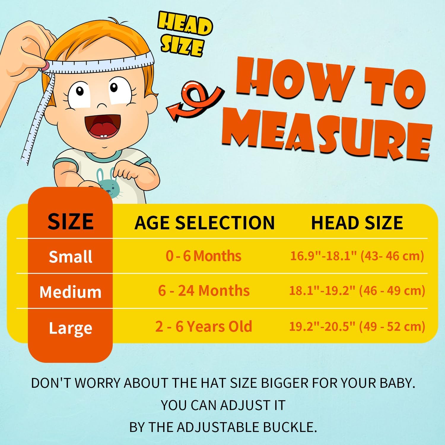 - ADJUSTABLE &VARIOUS SIZE: Our baby bucket hat have 3 sizes to choose from: 0-6 months fits head circumference 16.9"-18.1"; 6-24 months fits head circumference 18.1"-19.2"; 2-6 years fits head circumference 19.2"-20.5". The age is only for reference, you can choose the perfect size according to your baby's head girth. Also The stretchy headband and rope buckle behind the sunshade hat can adjust the head circumference for a comfort fit
