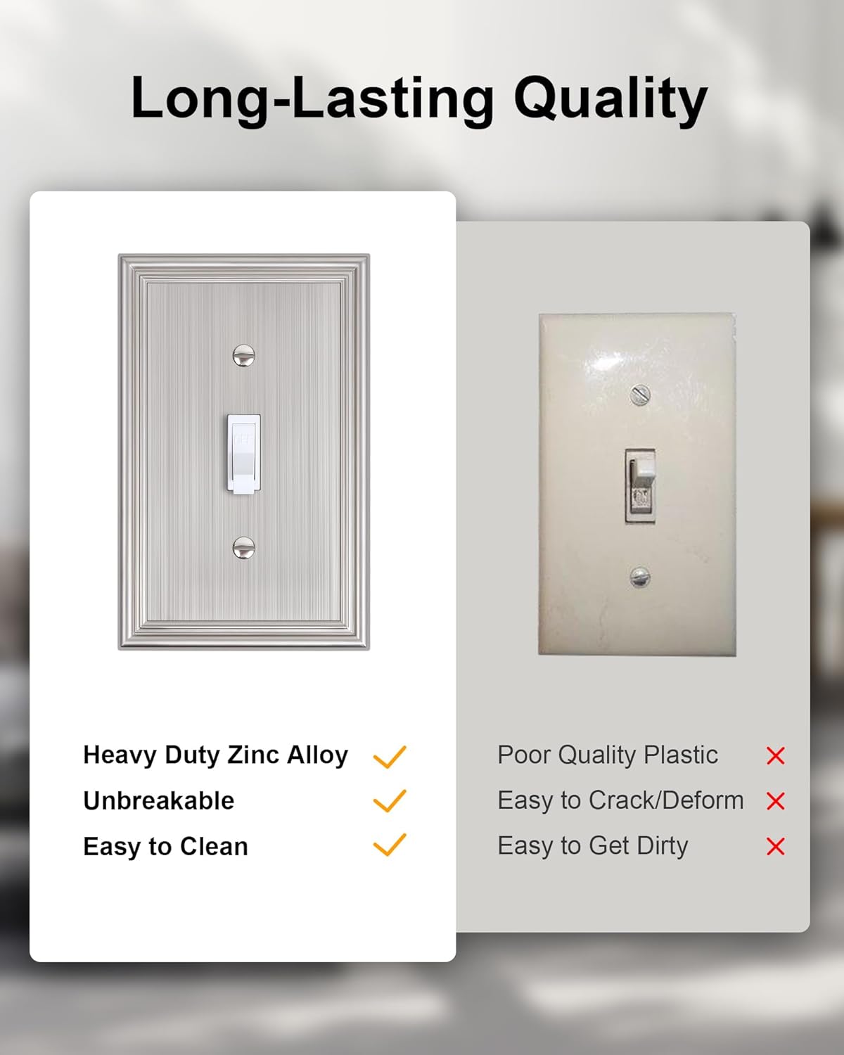 - Durable Solid Zinc Alloy - Constructed from thick and sturdy zinc alloy, the light switch cover plate offers exceptional durability and sturdiness, easier to clean and maintain. It is resistant to high impact, tarnishing, and corrosion, unbreakable. Ensuring it remains its stunning appearance for years to come.