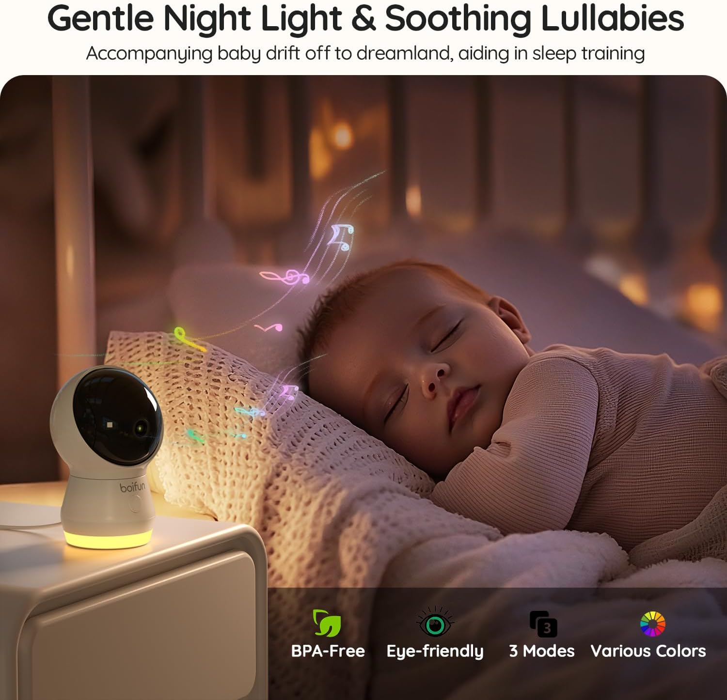 - [Sleep-Friendly Features: Night Light, Lullabies & Infrared] This boifun baby monitor includes a soothing color night light, lullabies, and invisible infrared lighting. A thoughtful baby video monitor with camera that creates a relaxing bedtime while protecting your baby’s vision. Perfect for parents seeking a baby monitor with camera wifi for sleep-sensitive babies.