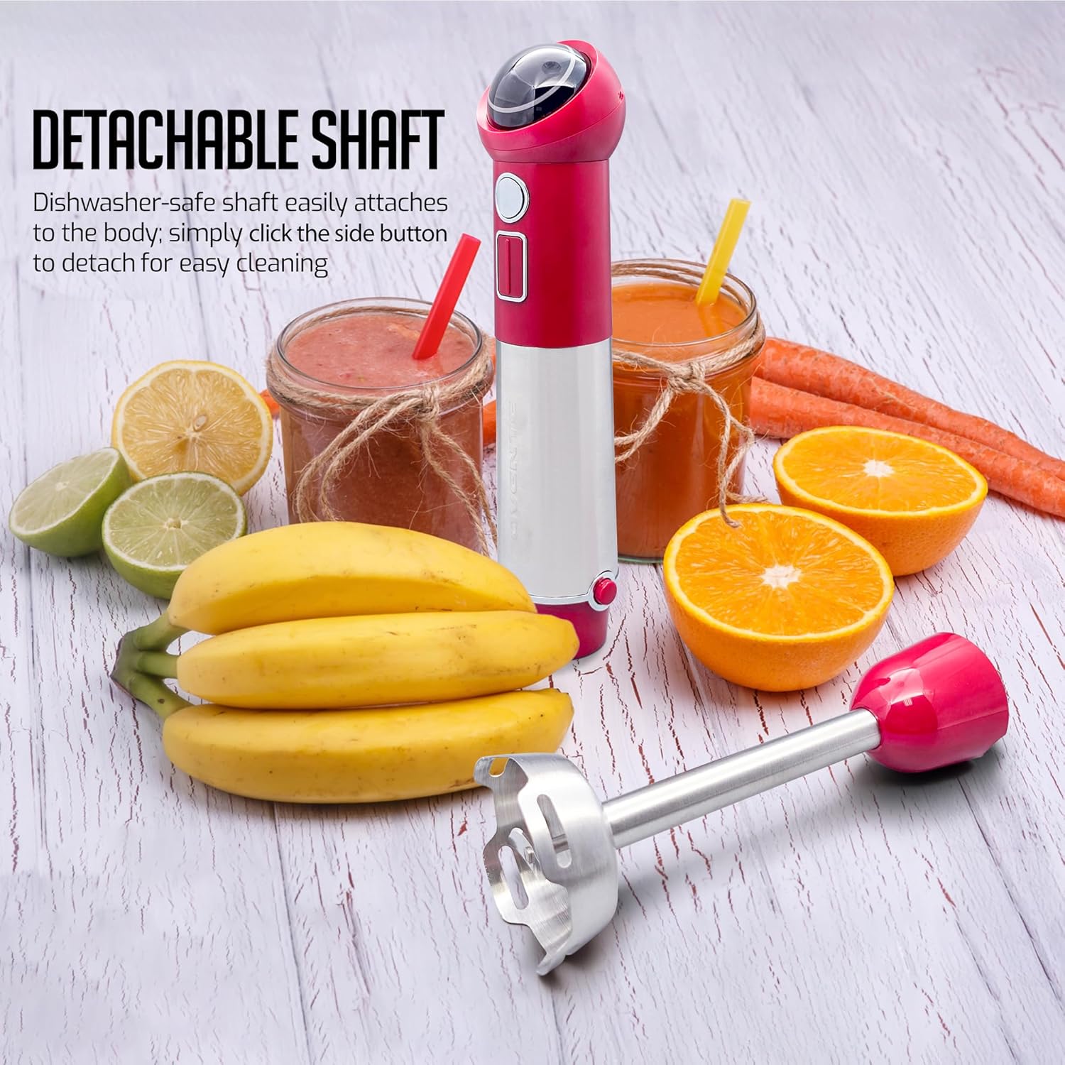 OVENTE Cordless Immersion Hand Blender, 300W Rechargeable Handheld Portable Stick Mixer with Speed Pulse Activating Sensor and Stainless Steel Blades for Smoothies, Shakes or Baby Food, Red HR995R